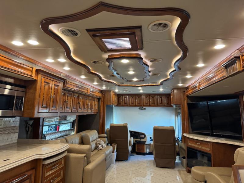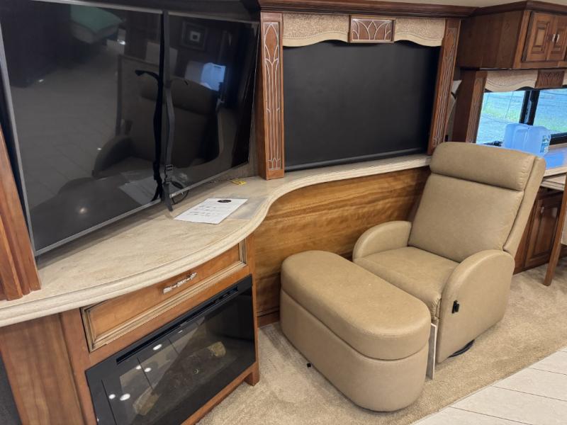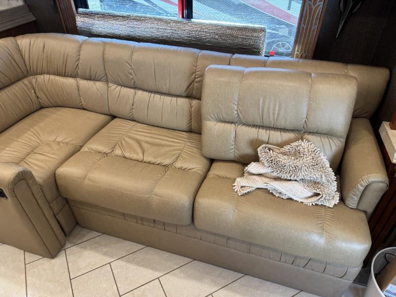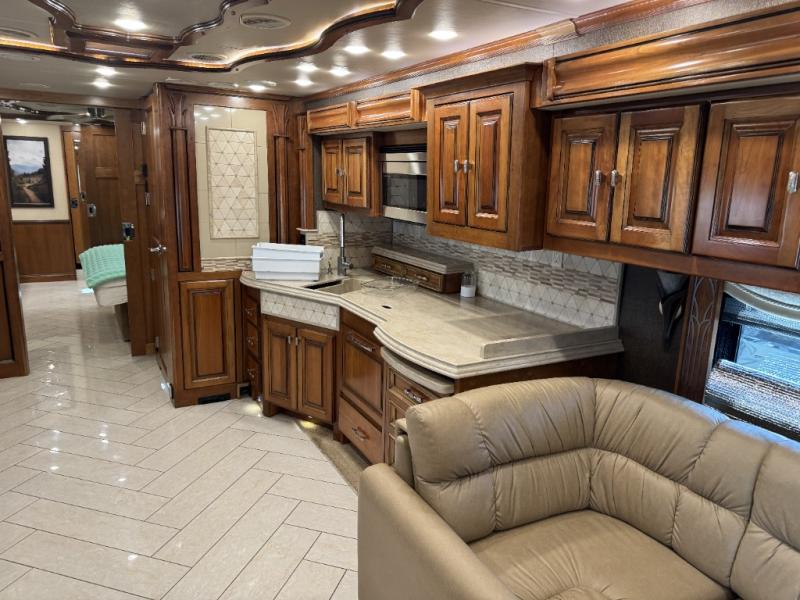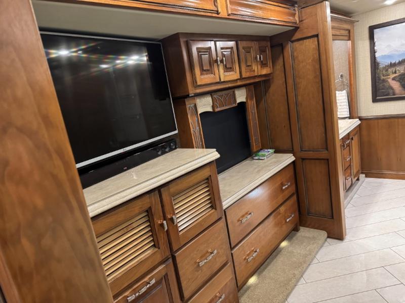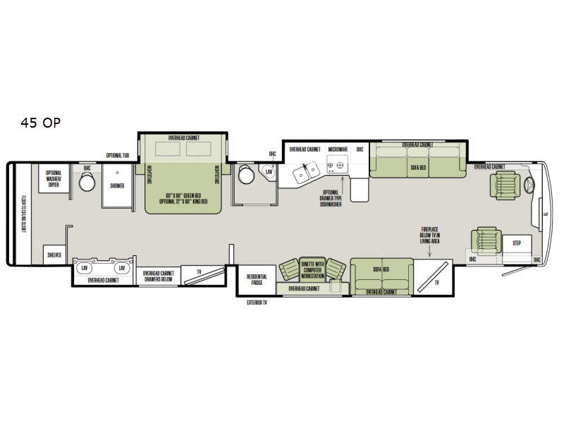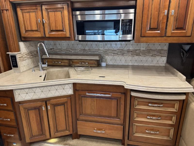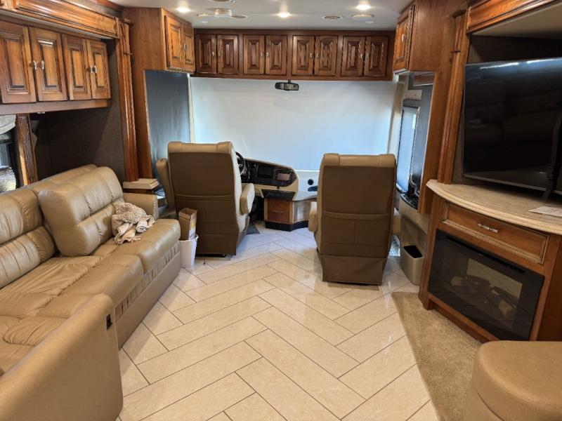 As you enter the motor home, in the front cab there is an overhead TV. The kitchen and living areas are open and spacious with two slide outs. One slide has a TV with a fireplace below the TV, sofa bed, dinette with computer work station, and a refrigerator. Overhead cabinets can be found in that slide. Along the opposite side of the motor home there is another slide out with a sofa bed, two burner range, overhead microwave, and angled double kitchen sink.