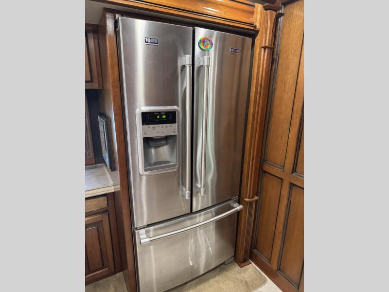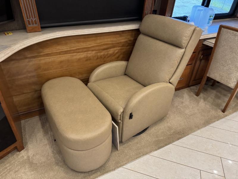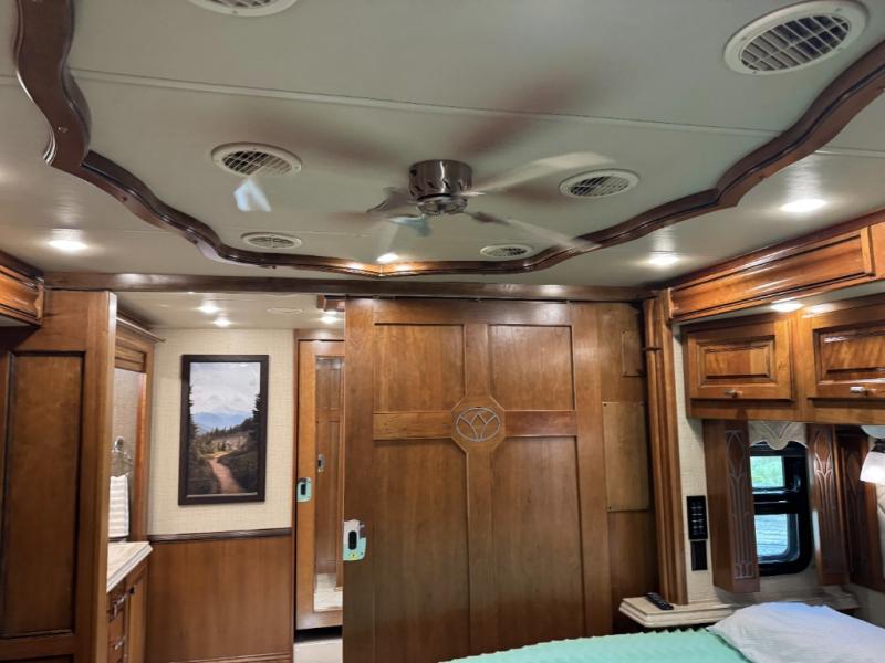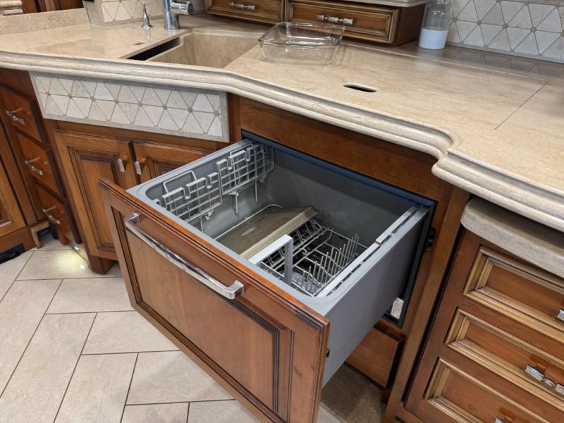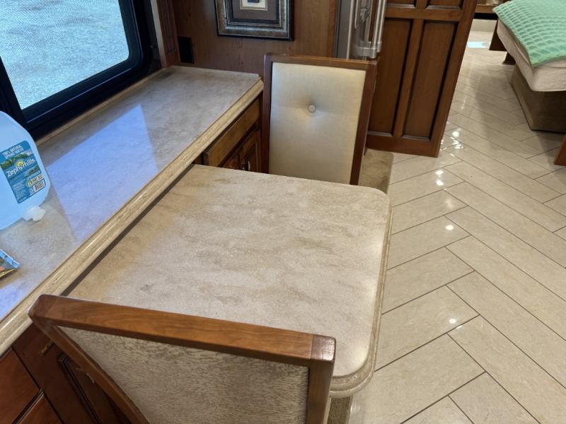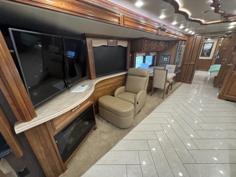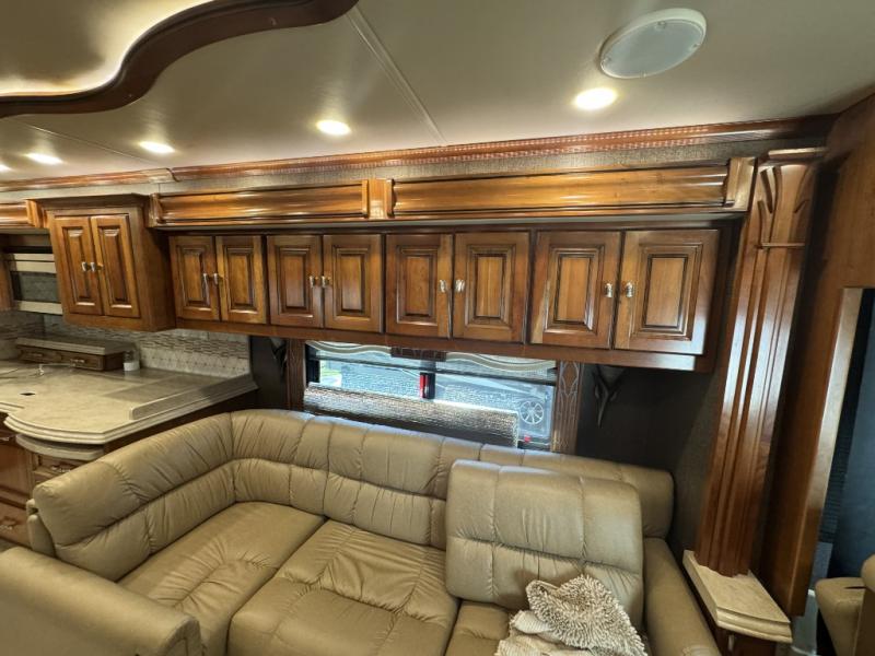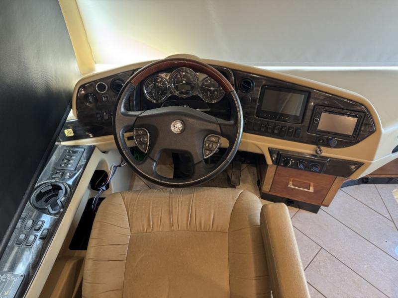 As you enter the motor home, in the front cab there is an overhead TV. The kitchen and living areas are open and spacious with two slide outs. One slide has a TV with a fireplace below the TV, sofa bed, dinette with computer work station, and a refrigerator. Overhead cabinets can be found in that slide. Along the opposite side of the motor home there is another slide out with a sofa bed, two burner range, overhead microwave, and angled double kitchen sink.