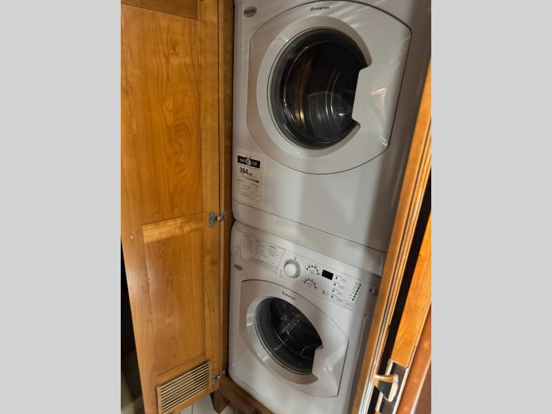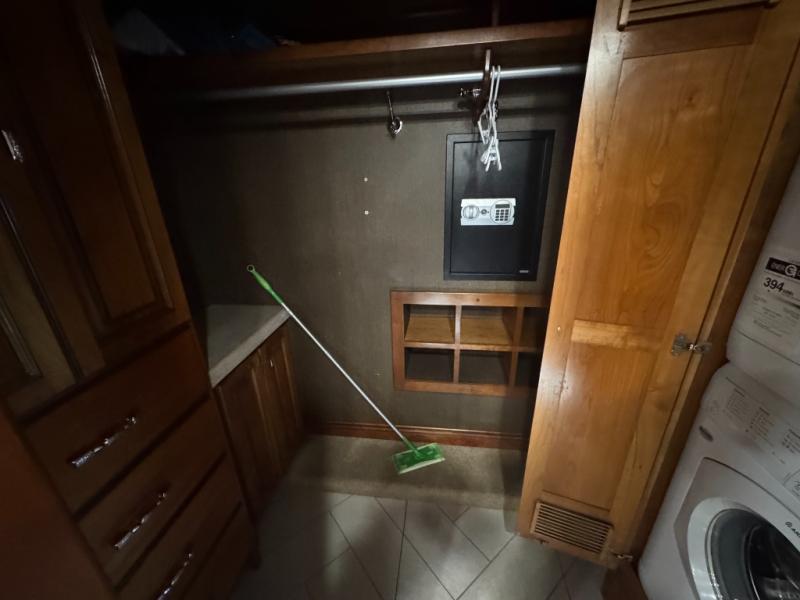 The very rear of the motor home has an optional washer/dryer, floor to ceiling closet for your hang up clothes, and a set of shelves, and more!