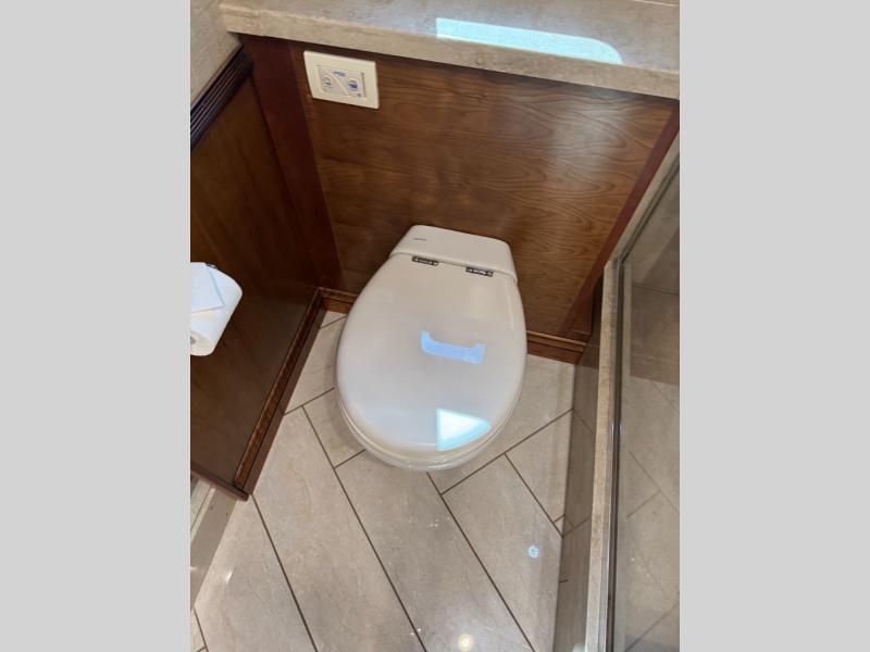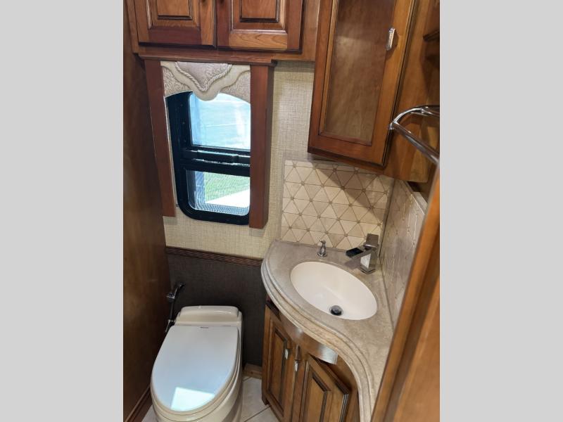 Proceeding toward the rear of the motor home you will find a half bath. Here there is a toilet, sink, and an overhead cabinet.