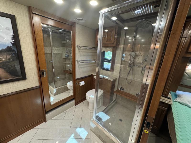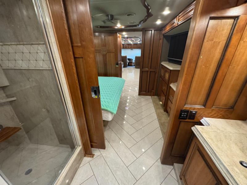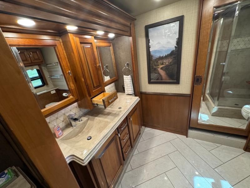 The bedroom has two slide outs. The first slide has a queen bed or you can choose an optional king if you prefer a bit more room while you sleep. On either side of the bed there is a nightstand, and above you will find an overhead cabinet. Across from the bed there is a TV, drawers, and in the bathroom there are his and her sinks. Across from the sinks you will find a shower and toilet.