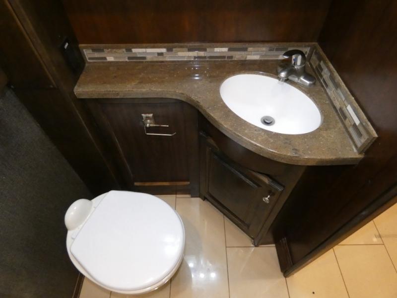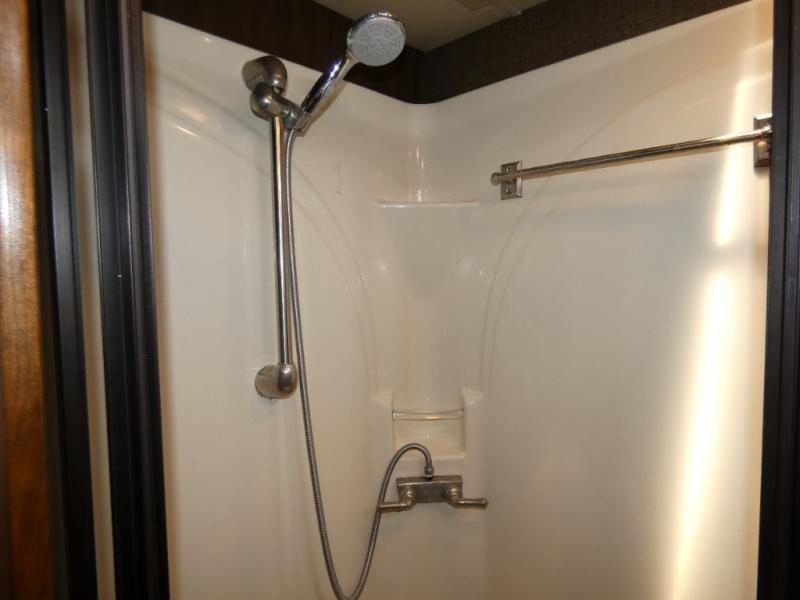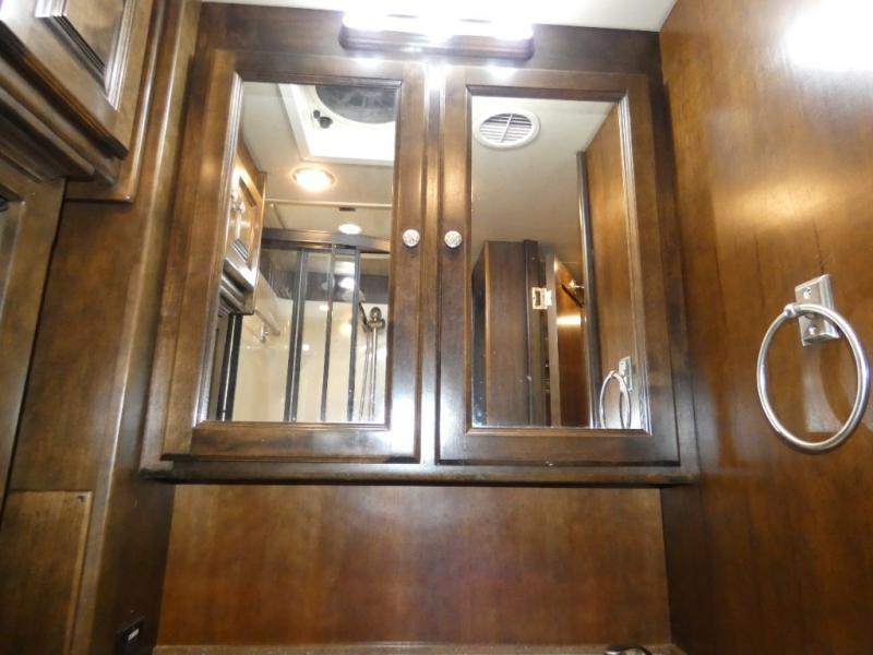 As you continue toward the rear of this Allegro RED notice a side aisle bath on your right. The bath features a corner shower, toilet, linen cabinet, and vanity with sink.