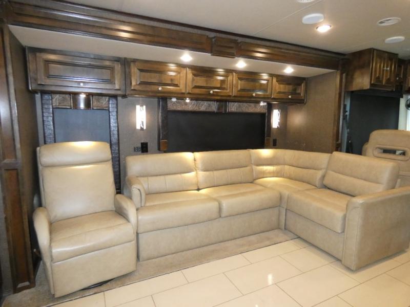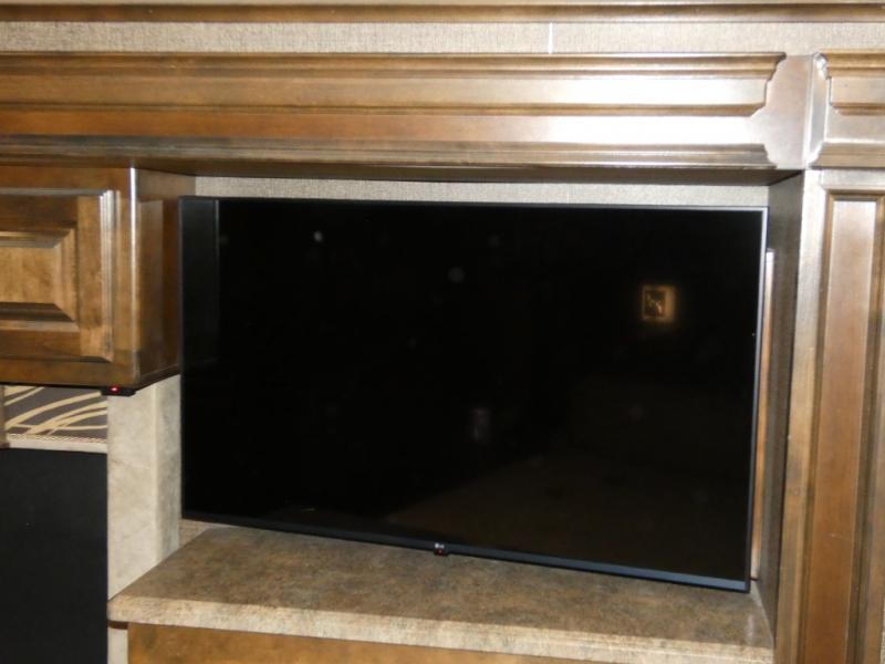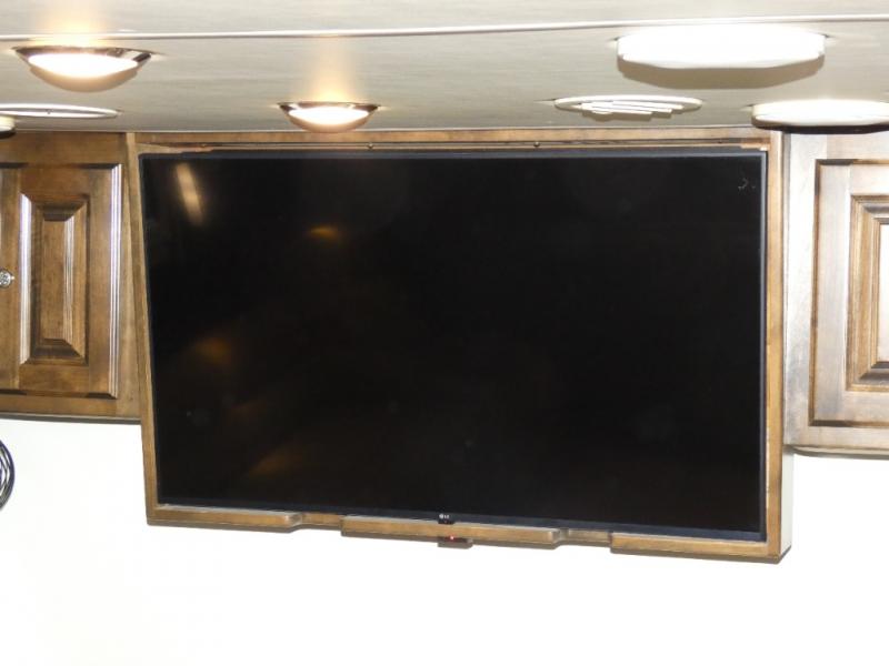 Opposite the booth dinette find a second main living area slide with a sofa bed including storage above, plus a lounge chair. There is also a standard flat screen TV located along the interior wall next to the lounge chair.