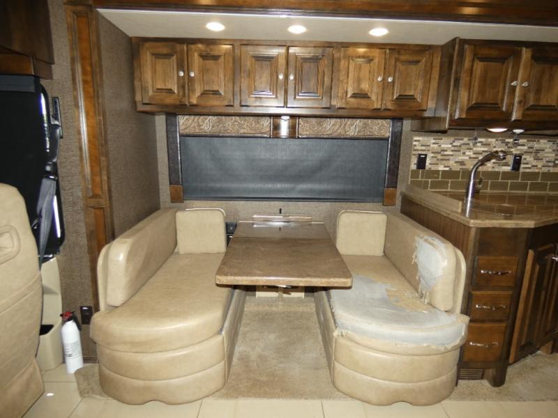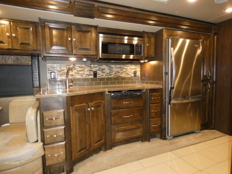Step inside just in front of the passenger seat and take a look back. With all slides fully extended you will have plenty of room to enjoy. There is a booth dinette and all of the kitchen amenities directly behind the passenger seat in a large slide out. The kitchen amenities includes: a double sink, a three burner range with microwave oven, and a two door refrigerator, plus pantry for dry good storage.