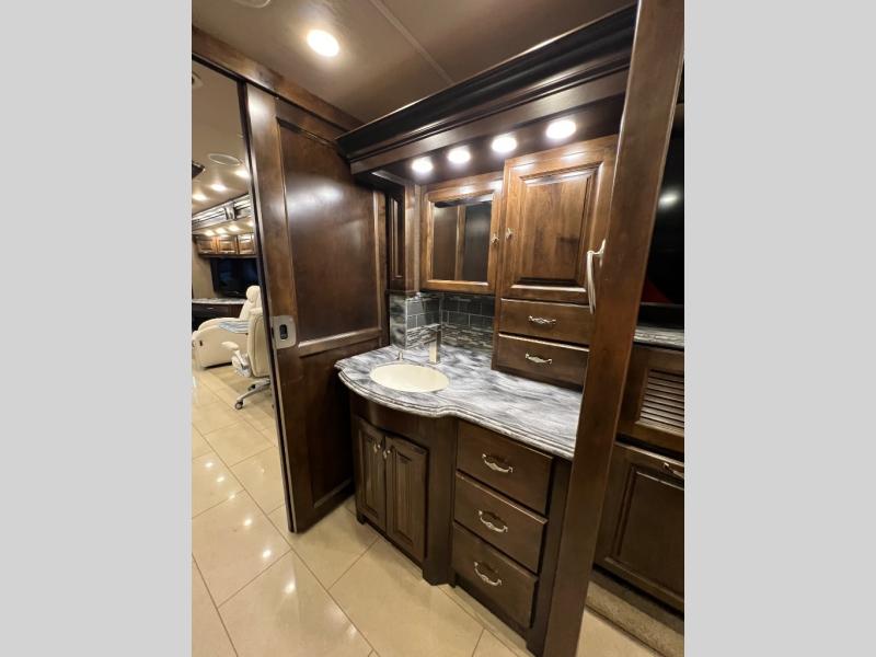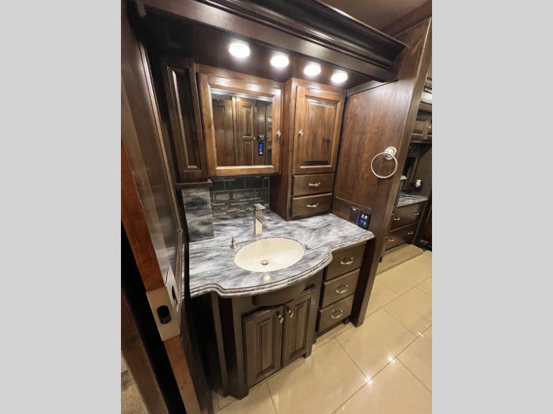 Just outside the bedroom, this slide continues with overhead cabinets and a large vanity with sink. A side aisle bathroom is across the hall and includes a corner shower, toilet, and corner vanity sink.