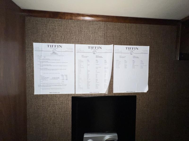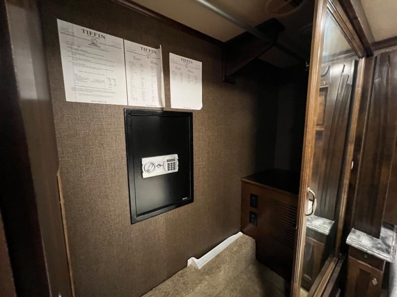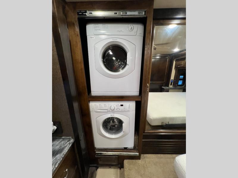 The Tiffin Phaeton 36 BH class A diesel motorhome offers a rear bedroom. The bed is within a slide out, and there is a nightstand on each side and and overhead cabinets above the head of the bed. The rear wall of the coach holds a large closet as well as a corner closet for an optional washer/dryer. The wall opposite the bed includes another slide with an overhead cabinet, a TV, a hamper, and drawers below.