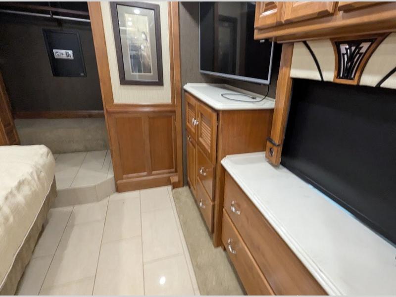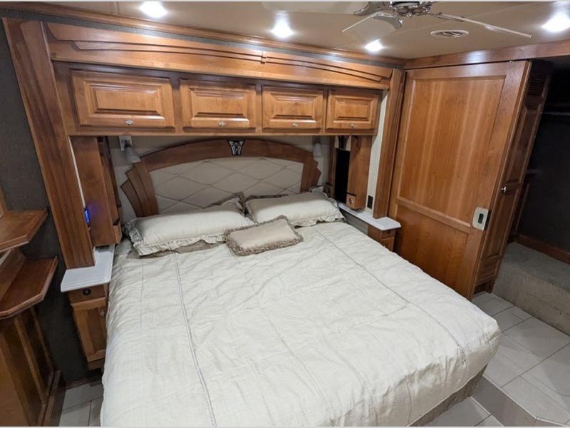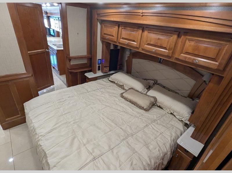 Moving into the master bedroom, the queen size bed (king optional) with nightstands at each side and overhead cabinets is on a slide. The wall opposite the bed includes a large slide that starts in the bedroom with an overhead TV, overhead cabinets and drawers below.