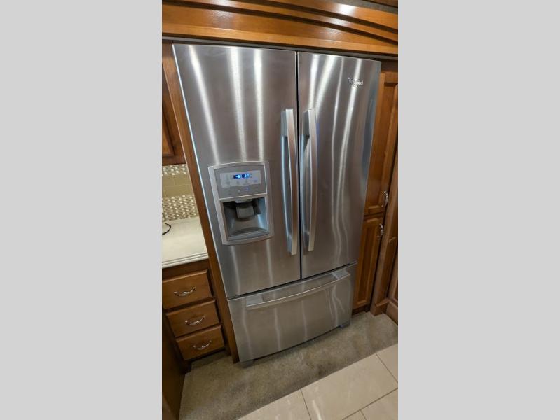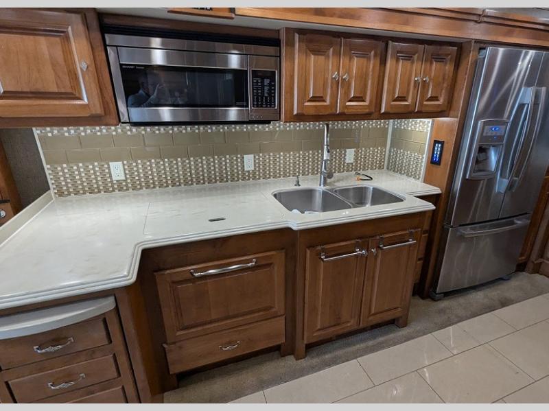 Moving down the curb side, another larger slide out holds a booth dinette, overhead cabinets, counters, an optional drawer type dishwasher, a range, overhead convection microwave, double kitchen sink, residential refrigerator and pantry. You may choose an optional exterior TV, an optional u-shaped dinette or an optional dinette with computer workstation, and more!