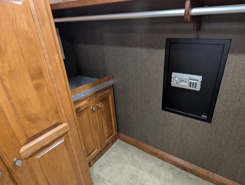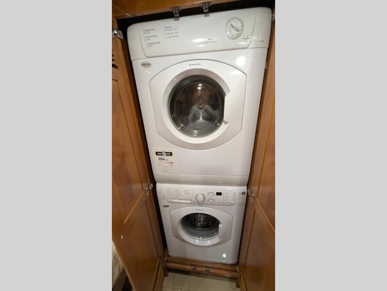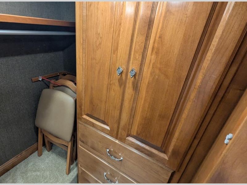 At the rear of this class A diesel coach there is a shelf with hanging rod below, drawers, and a closet for an optional washer/dryer all within a walk in wardrobe.