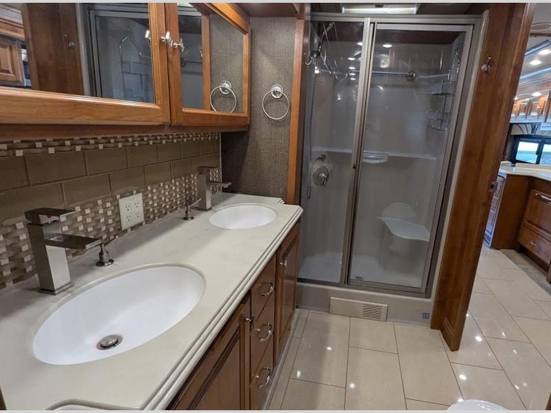 The slide out continues into the side aisle bathroom with his and her sinks and overhead cabinets. The bath also includes a toilet, a shower and access from either the bedroom or the living area.