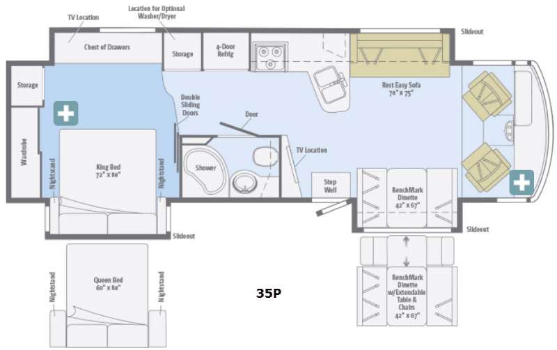 The full wall slide starting behind the driver's seat features a Rest Easy sofa, an angled double kitchen sink and countertop, three burner range, and a 4-door refrigerator. There is also a storage cabinet that has been prepped for an optional washer and dryer, plus the slide continues to the rear ending with a chest of drawers and TV location for a 32" bedroom HDTV.