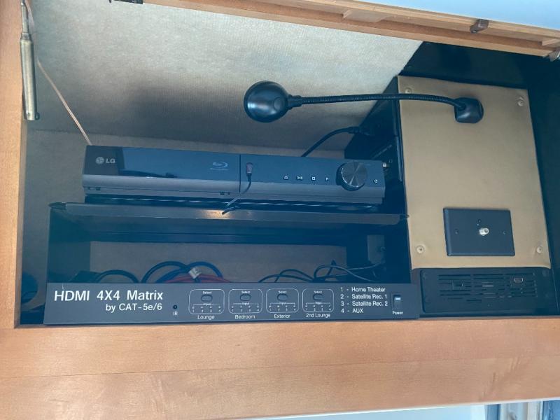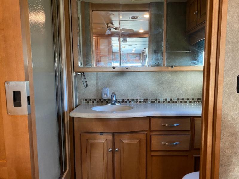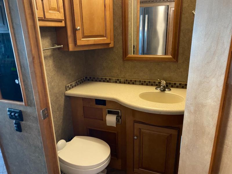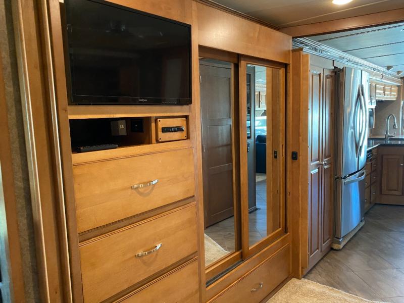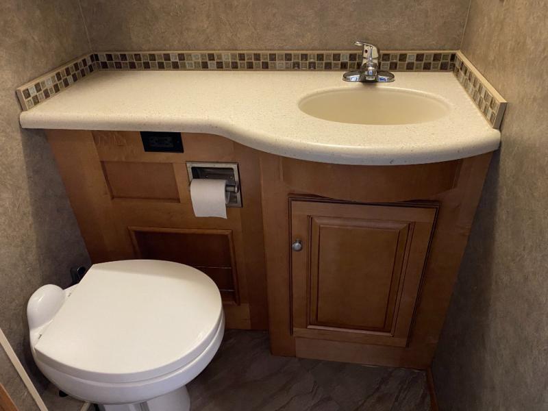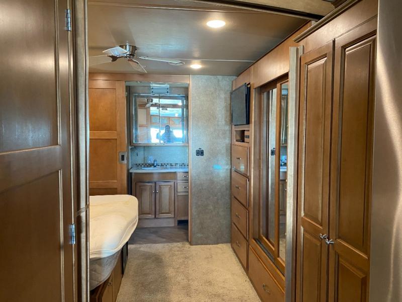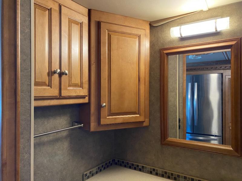 The master suite offers true luxury with a king bed, a large wardrobe, additional overhead storage, and its own entertainment center. Connected to the bedroom is the spa-like rear bath, complete with a large shower, solid-surface vanity, porcelain toilet, and generous storage. The 37F also includes a convenient mid-coach half bath, making it perfect for hosting guests or traveling with family.