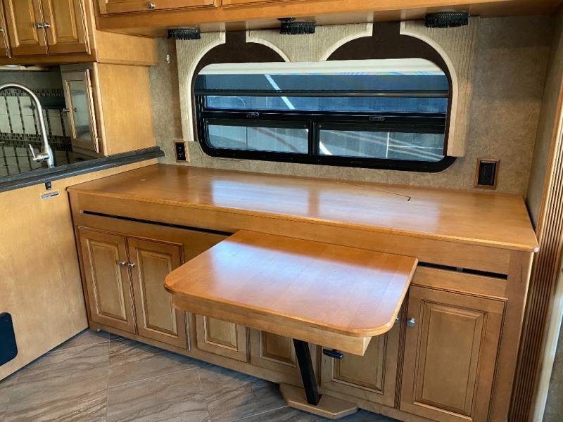 Step inside and you’re greeted with a beautifully designed living room featuring plush seating, a large sofa, and a comfortable dinette that doubles as a workstation or dining area. The high-quality furnishings, elegant cabinetry, and premium flooring give this motorhome a welcoming, upscale feel.