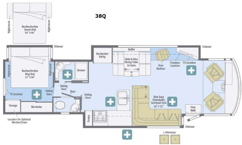 Expands your interior living space with opposing living room slides and a third slide in the master bedroom. -