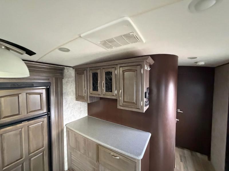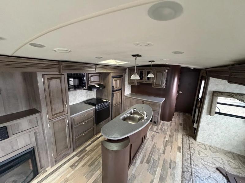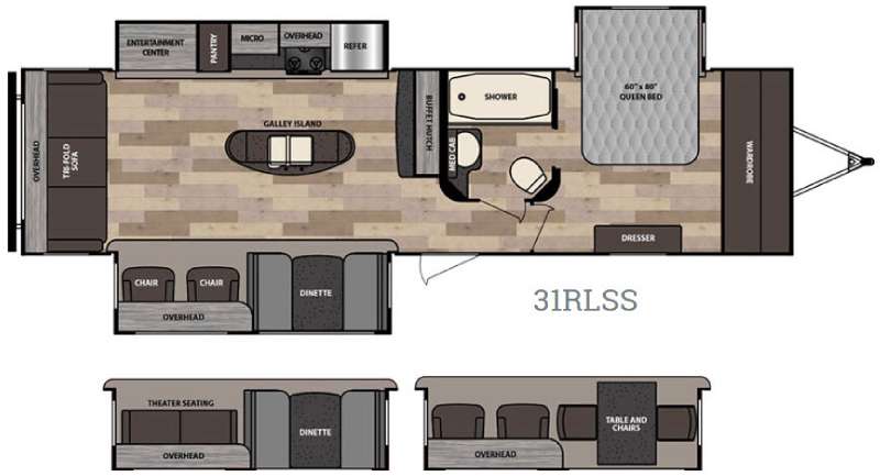 As you enter to your left is a slide out featuring a booth dinette, and two chairs with overhead storage opening up this combined living room and kitchen area. On the opposite side is the second slide including the kitchen amenities: a refrigerator, three burner range, countertop space, microwave, overhead storage, and a pantry. A buffet/hutch is on the interior wall and a galley island with a double kitchen sink completes the dream kitchen on wheels.