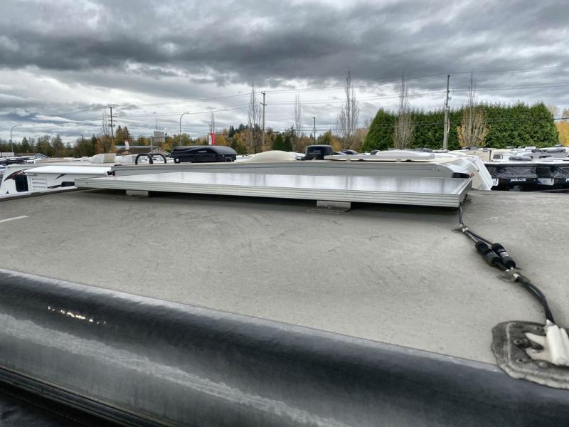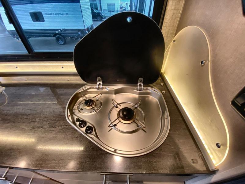 The kitchen area is to the left of the entry door and features a double sink, a two burner cook-top, and refrigerator. You will also find plenty of overhead cabinets for storage too. Above the sink area is where you will find a 28" HDTV for viewing when seated at the dinette opposite.