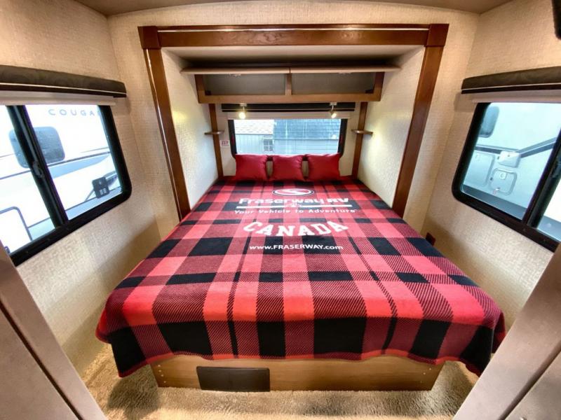 The rear bedroom in model 24G features a slide out rear queen sized bed with overhead storage cabinets for your things. There is also a spot to mount an optional flat screen 24" HDTV in the bedroom just off the foot of the bed along the wall.