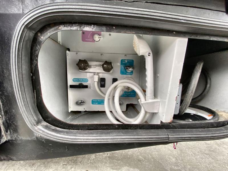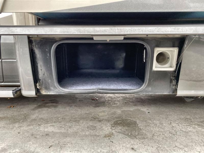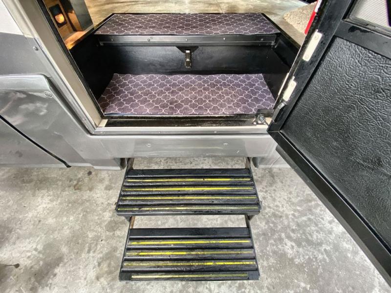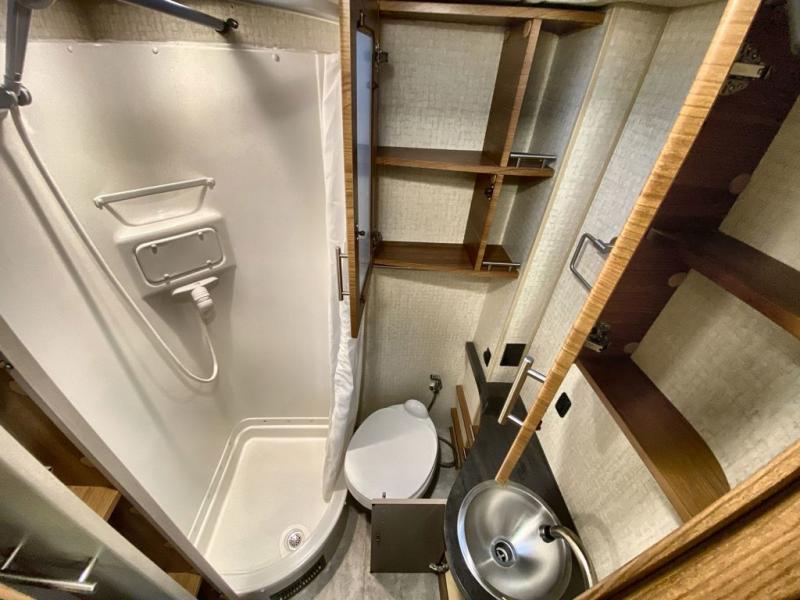 Beyond the dinette heading toward the rear of the coach you will find a side bath with a shower, toilet, and a unique swivel sink. A nice size wardrobe is found just around the corner from the bath along the curb side next to the refrigerator before you step into the bedroom floor area.