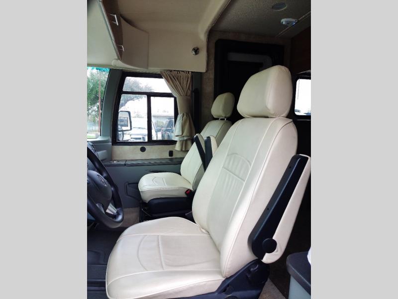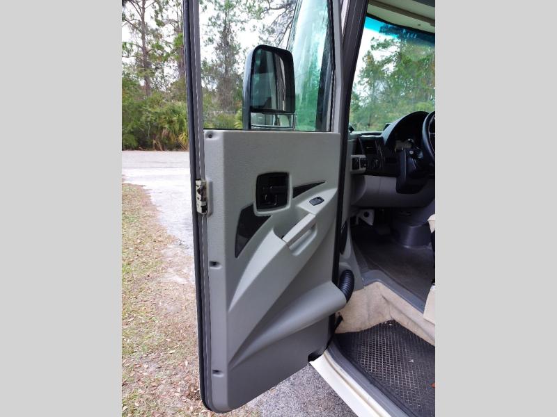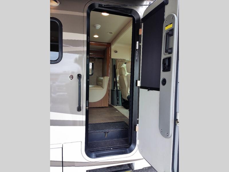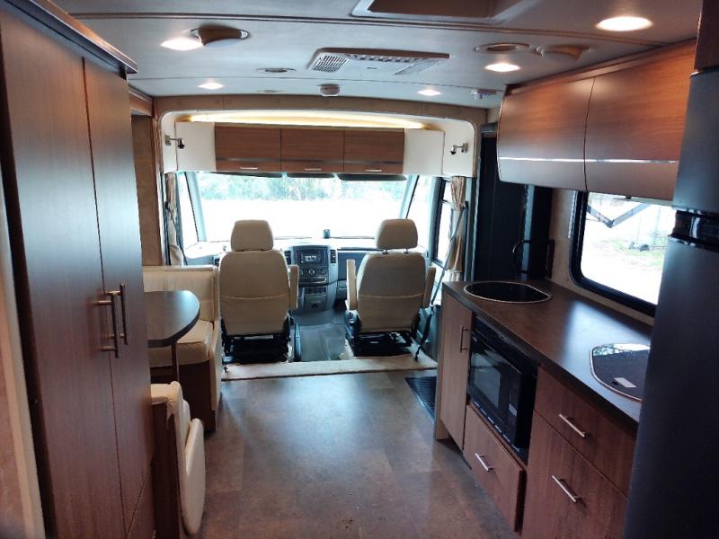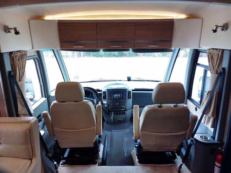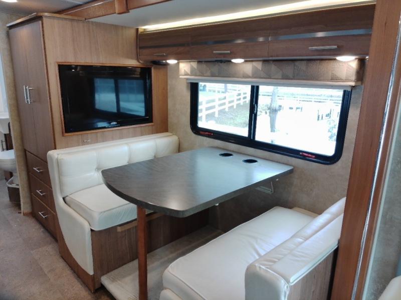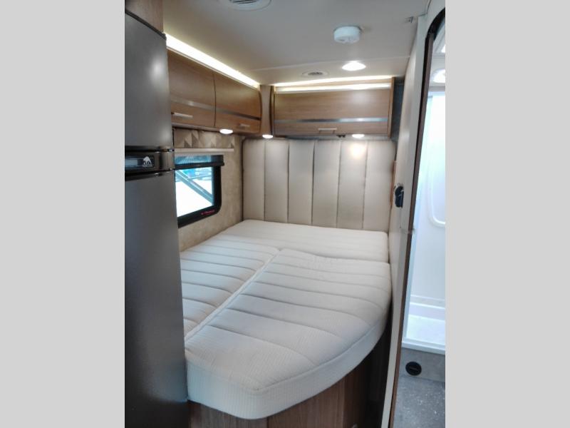 Offering versatility for a Class A Diesel on the Mercedes Benz Sprinter Chassis. The Winnebago Via 25P with a rear corner bed and the BenchMark Dinette. The 25P includes one slideout that houses the Dinette and the Wardrobe.