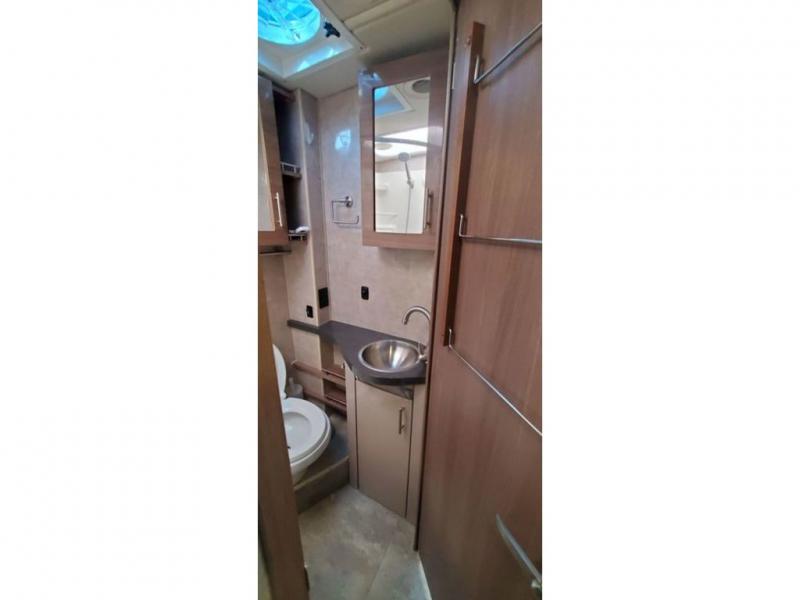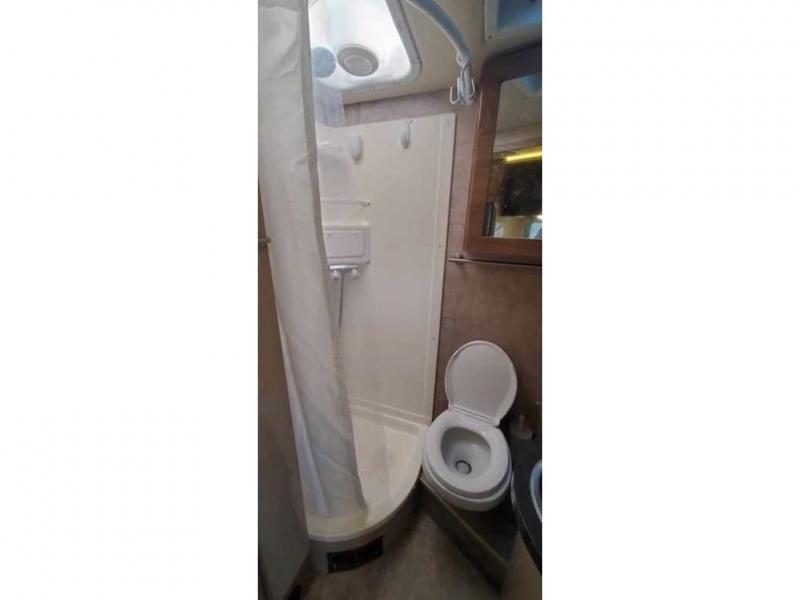 Beyond the sofa heading toward the rear of the coach you will find a complete bath with corner shower, toilet, linen cabinet, and vanity with round sink. A nice size wardrobe is found just around the corner from the bath before you step up to the bedroom floor area.