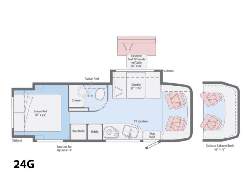 Take to the road in this Winnebago View and know that you will have everything you need to enjoy spending time away from home. Model 24G features a single slide for added space, a rear bedroom, and sleeping for five with the optional cabover bunk choice.