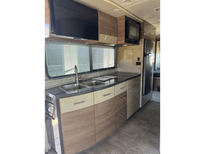 The kitchen is to the left of the entry door and features a double sink, counter space, a two burner cook-top, pantry, and refrigerator. You will also find plenty of overhead cabinets for storage too. A 28" HDTV is located above the sink area making it viewable from the sofa and front seats when swiveled, plus the cabover bunk if you choose to add.