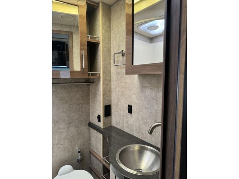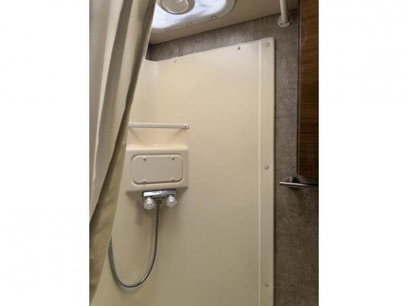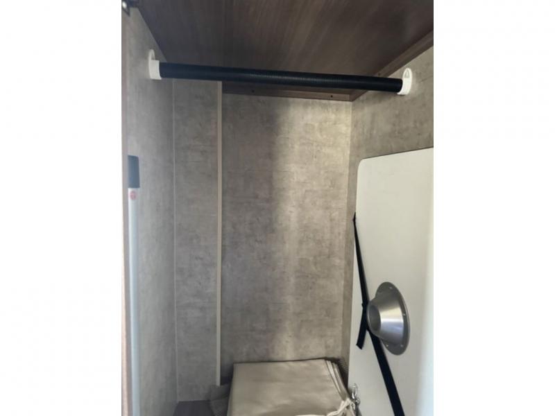 Beyond the sofa heading toward the rear of the coach you will find a complete bath with corner shower, toilet, linen cabinet, and vanity with round sink. A nice size wardrobe is found just around the corner from the bath before you step up to the bedroom floor area.