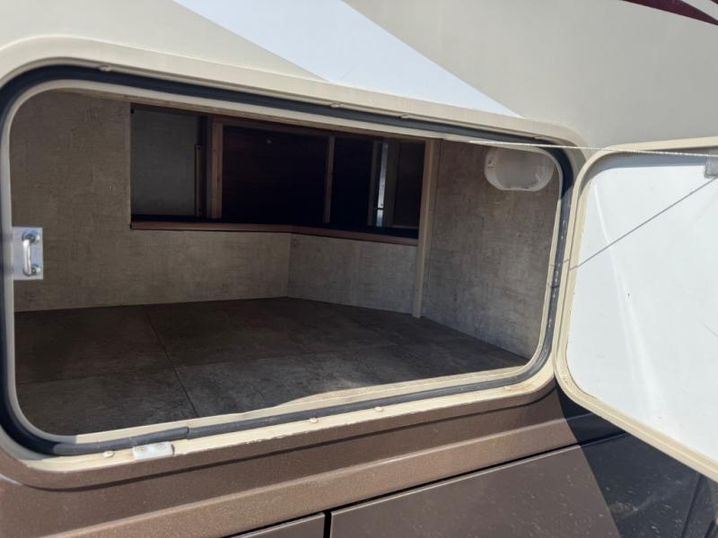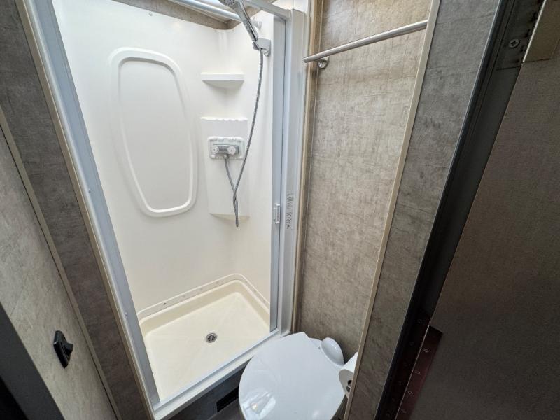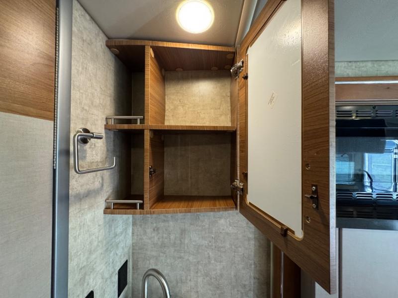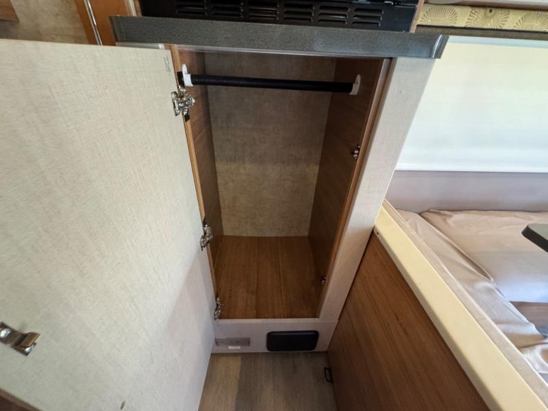 The rear double bed offers storage along the head of the bed, and also the curb side wall. There is a spot to add an optional flat screen 24" HDTV to the bedroom if you choose.