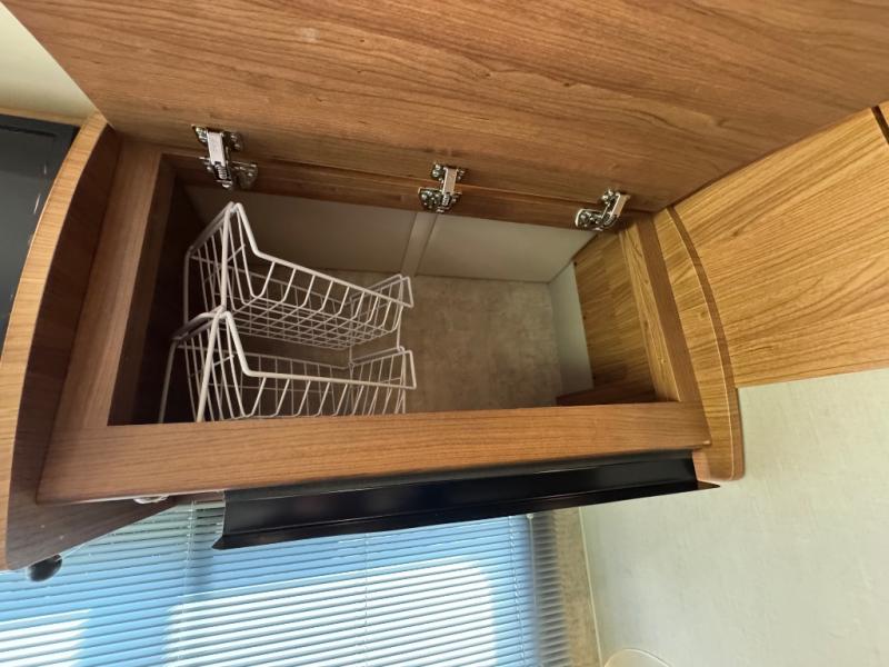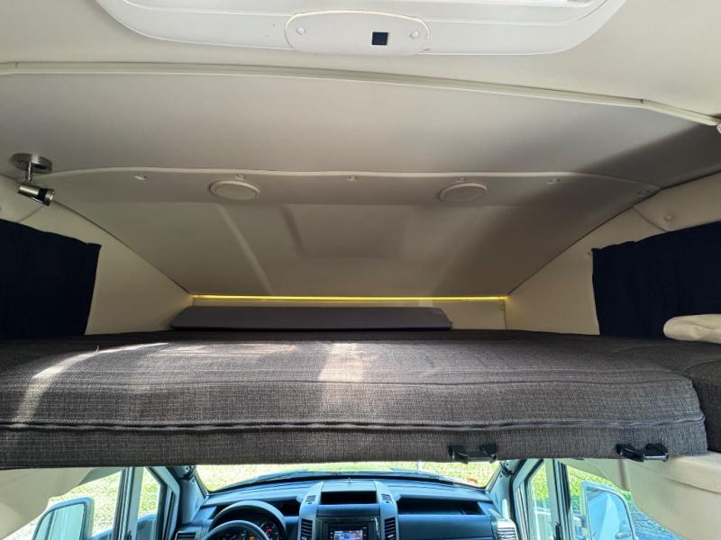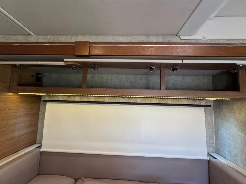 Step inside just behind the front passenger seat. Notice how both driver and passenger seat can swivel around creating additional seating space once parked. There is overhead storage on both sides of the cab area, or you can opt. for a cabover bunk that is 49" x 75", which easily makes room for one additional guest to sleep.