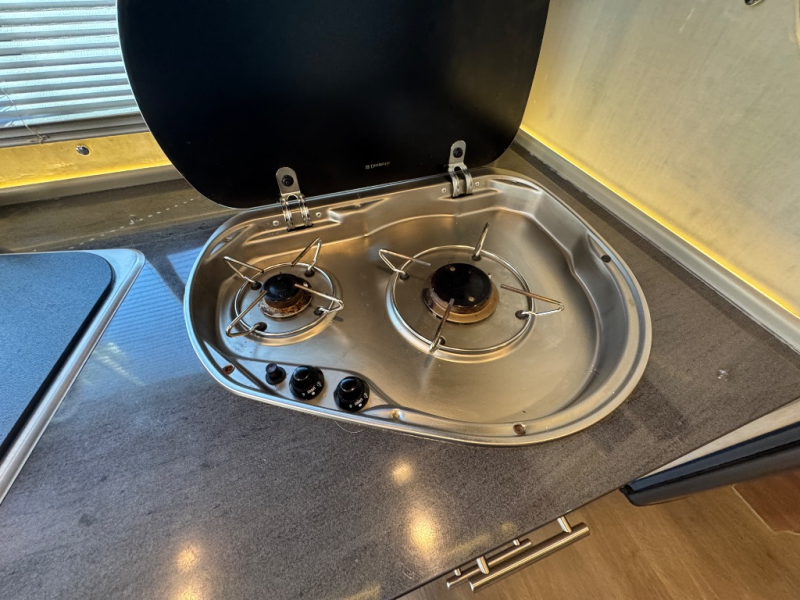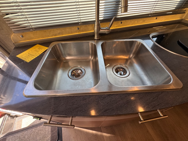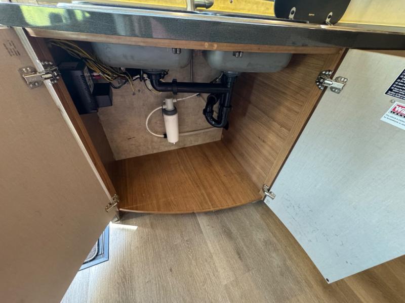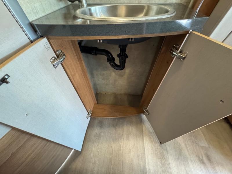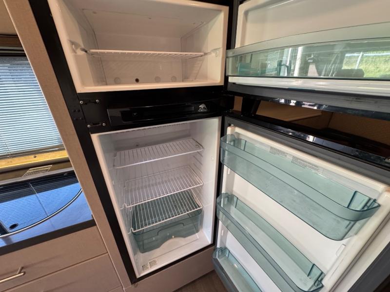 To the left of the entrance find all the kitchen amenities needed to create meals and snacks while you are on the road. There is a double sink, a two burner range top, overhead cabinets, and a refrigerator to keep your food items cold and fresh. The 28" HD TV is also located above the kitchen area which can easily be viewed from the dinette or front captains chairs.