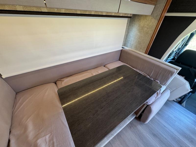 Straight ahead as you enter there is a slide out wardrobe and u-shaped dinette with foot rests on either end. Travel safely with three sets of seat belts attached to the dinette seating for rear travelers. There is also a 45" x 82" dining table that is perfect for enjoying a meal at.