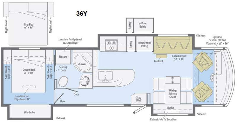 If you find you need a bit more space for sleeping you can choose to add the optional studio loft powered bed above the cab area that is 32" x 89". You can also choose an optional king size bed in place of the queen in the rear master, and a four door refrigerator, plus so much more!