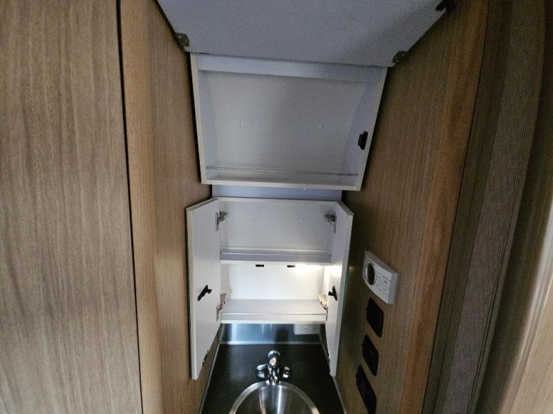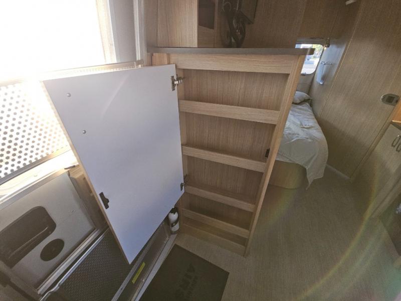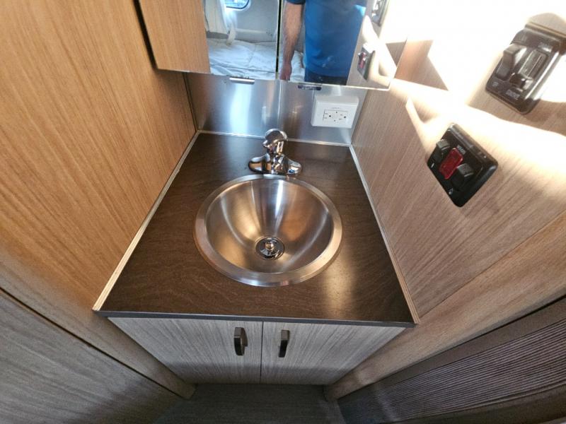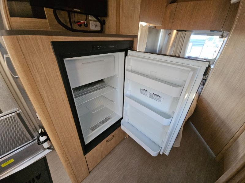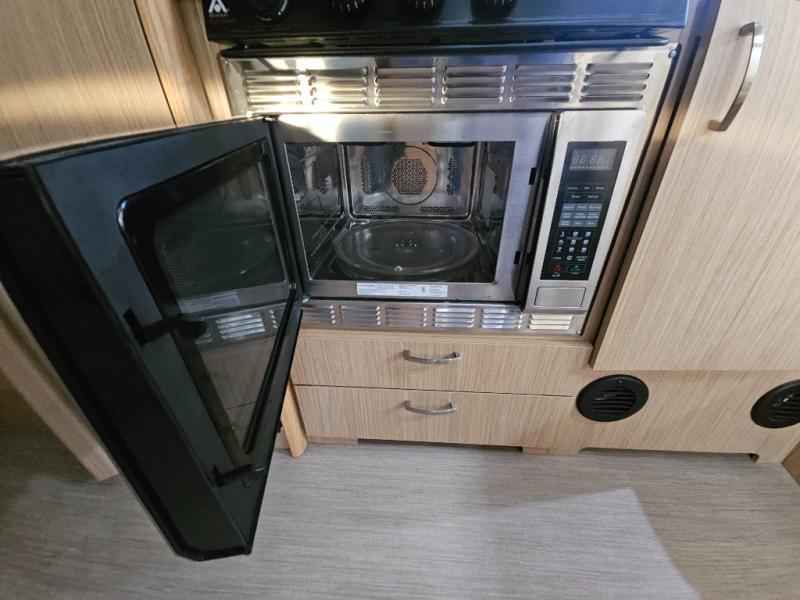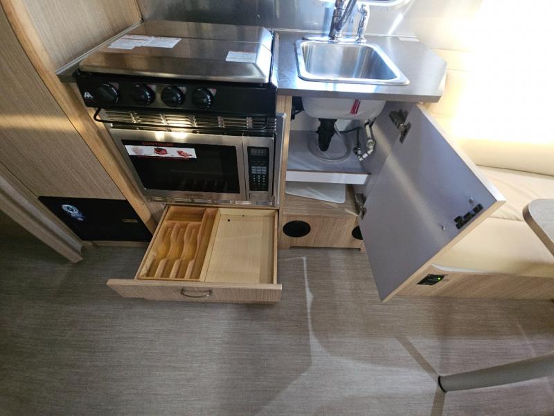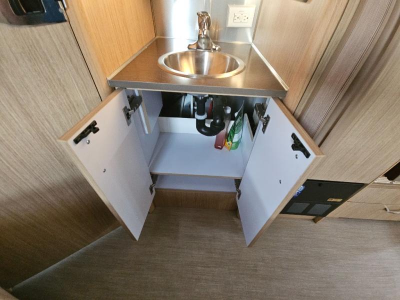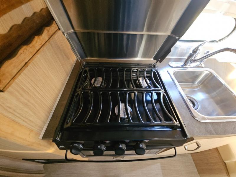 The galley has a pantry, and refrigerator with a LED TV above. On the opposite side of the travel trailer there is a single sink and three burner range. Next to the range you will find a wardrobe for all of your hanging clothes.