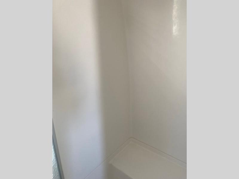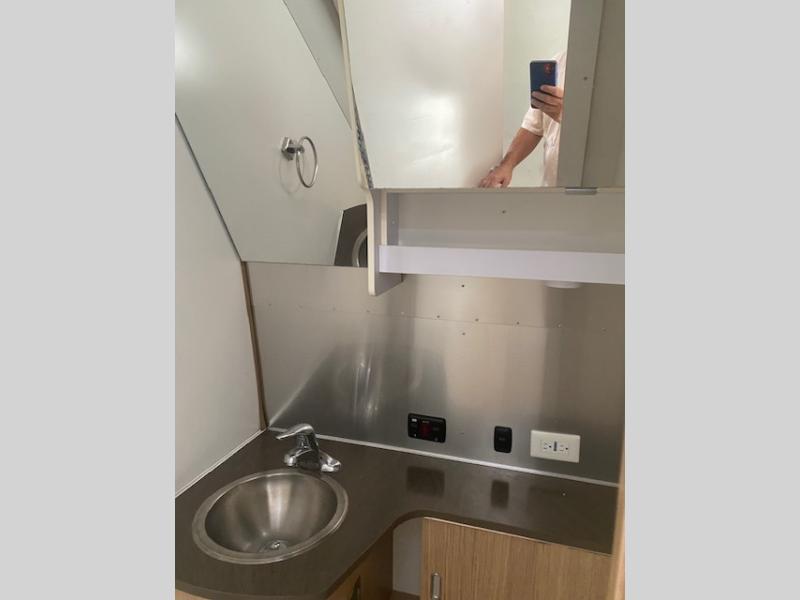The bathroom has a private toilet area with a sink on one side of the trailer and a shower on the opposite side.