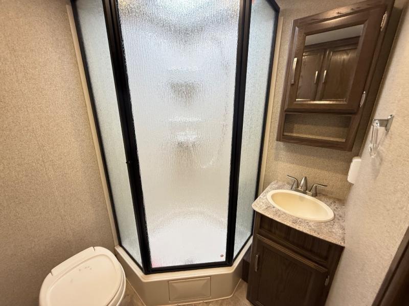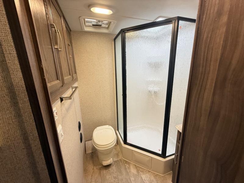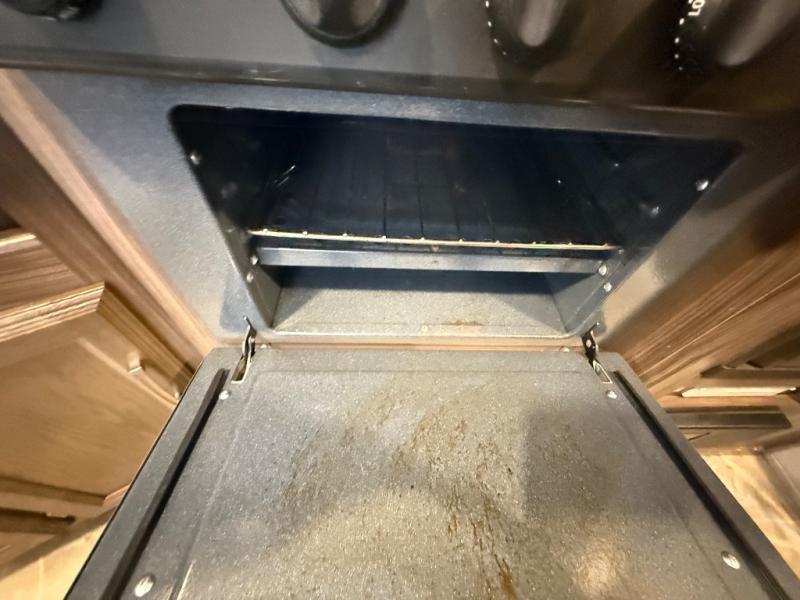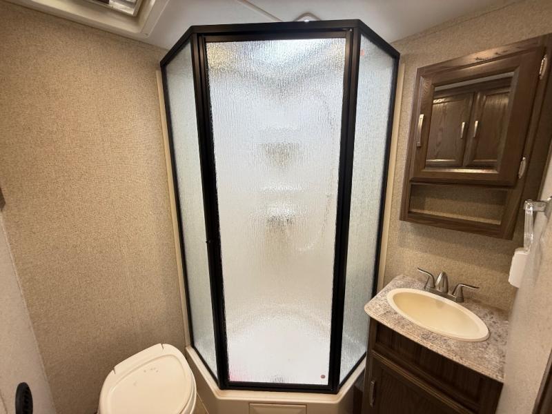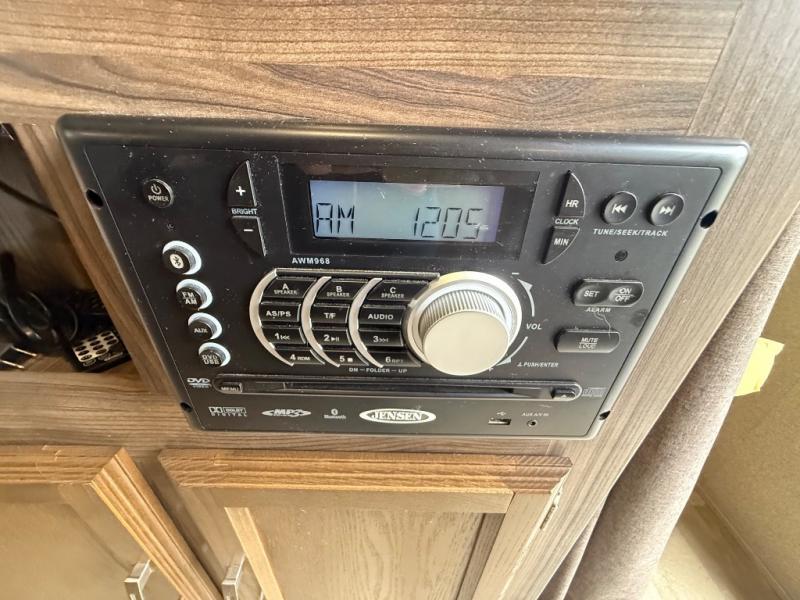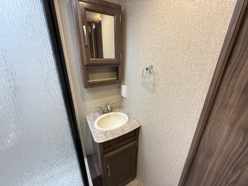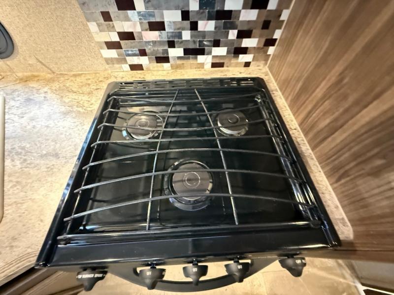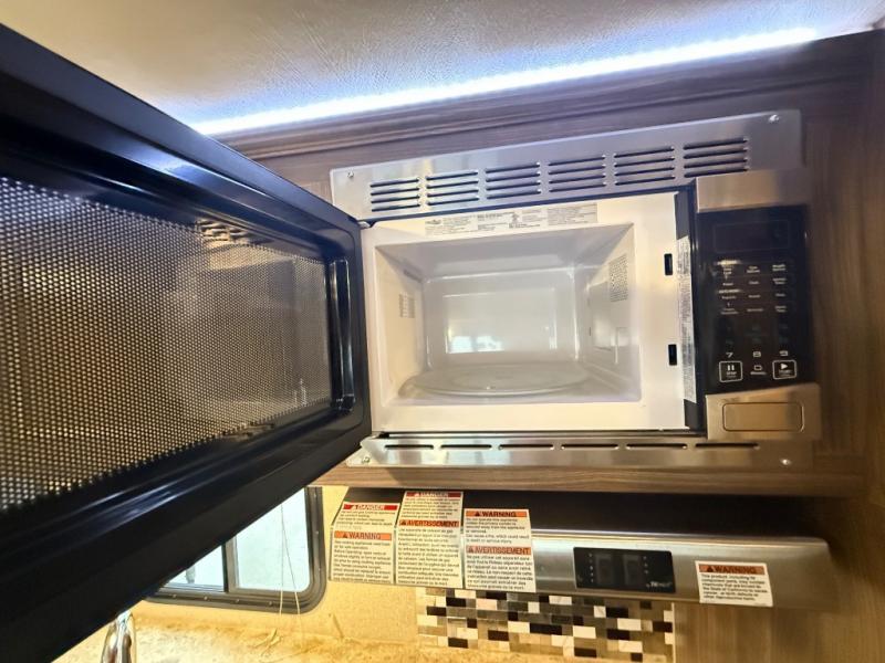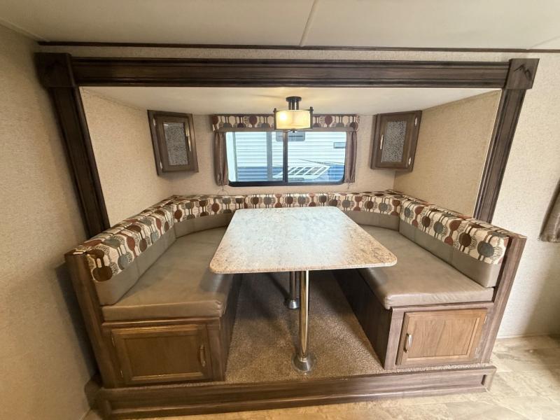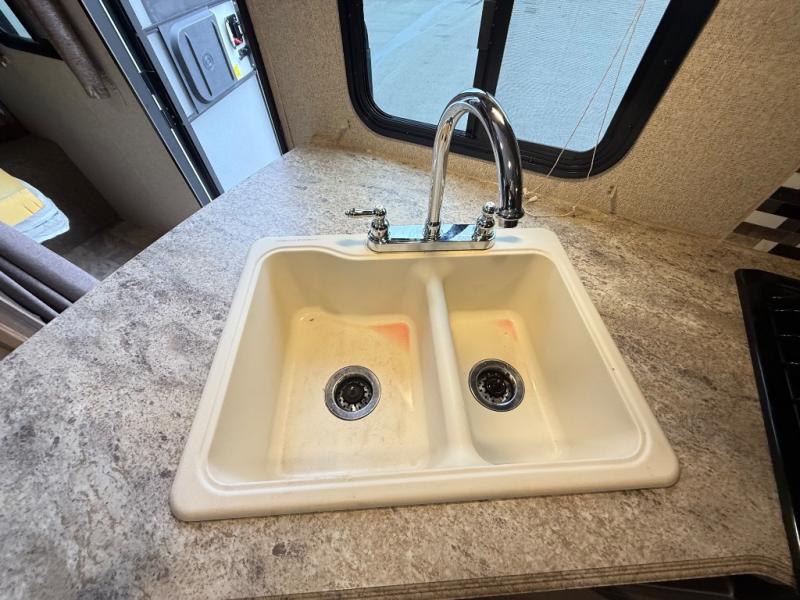 The main living area features a slide out u-shaped convertible dinette that is comfortable for dining or viewing the entertainment center. Enjoy cooking while you travel with a complete kitchen setup including a refrigerator, 3 burner range with overhead microwave, and double sink for doing the dishes. There is a pantry and overhead storage for your dry goods and anything else you might need.
