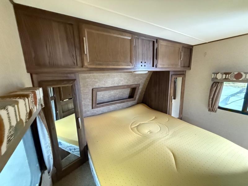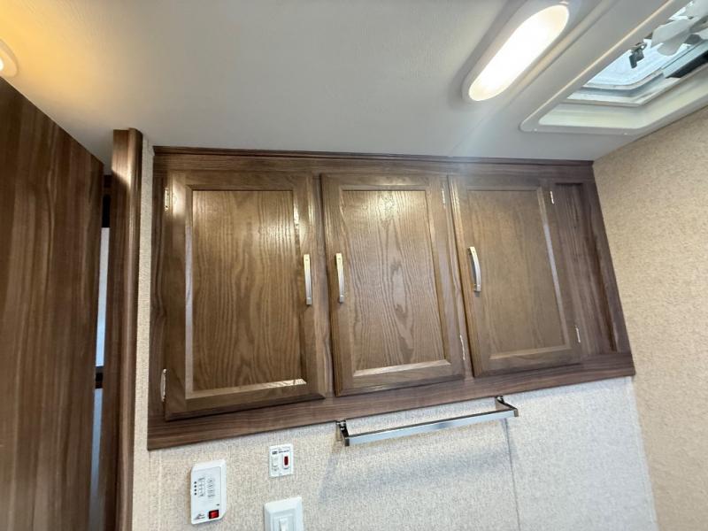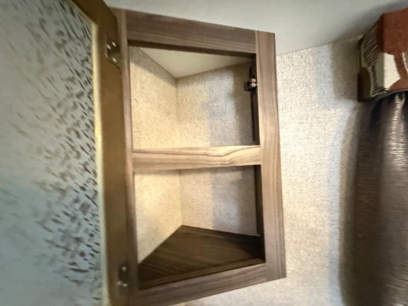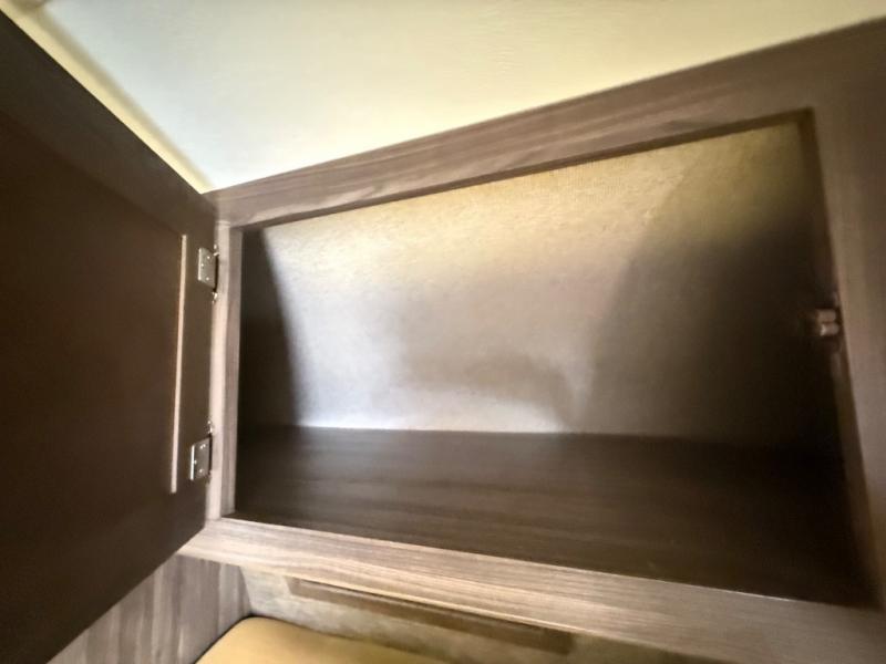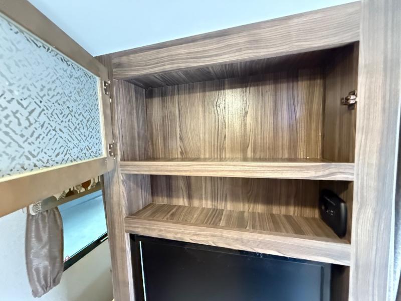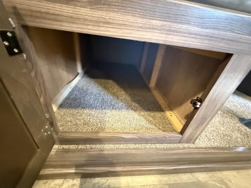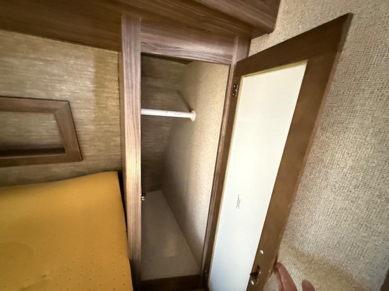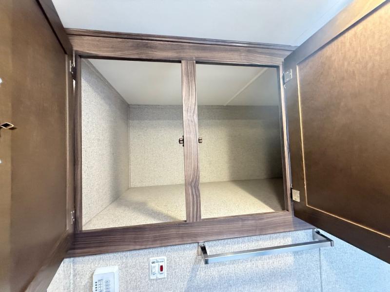 In the front you will see behind the entertainment center a comfy queen bed. With wardrobes and nightstands on both sides of the bed, plus a large overhead cabinet for extra storage. You can also pack things in the front pass-thru storage compartment that has two access doors.
