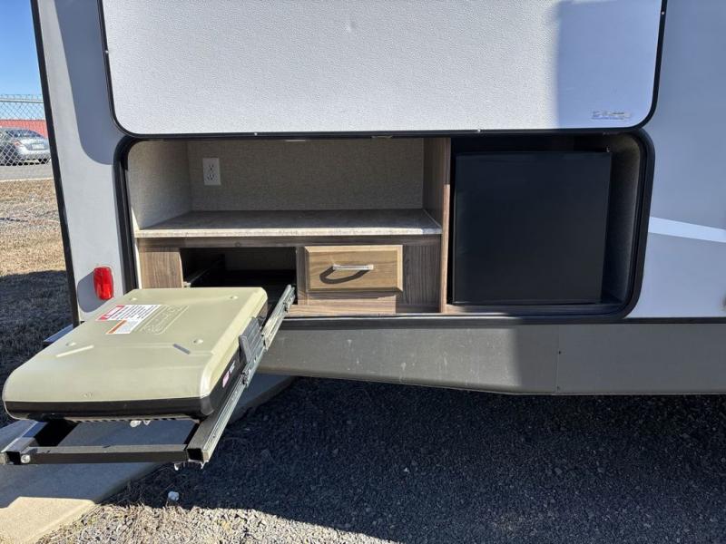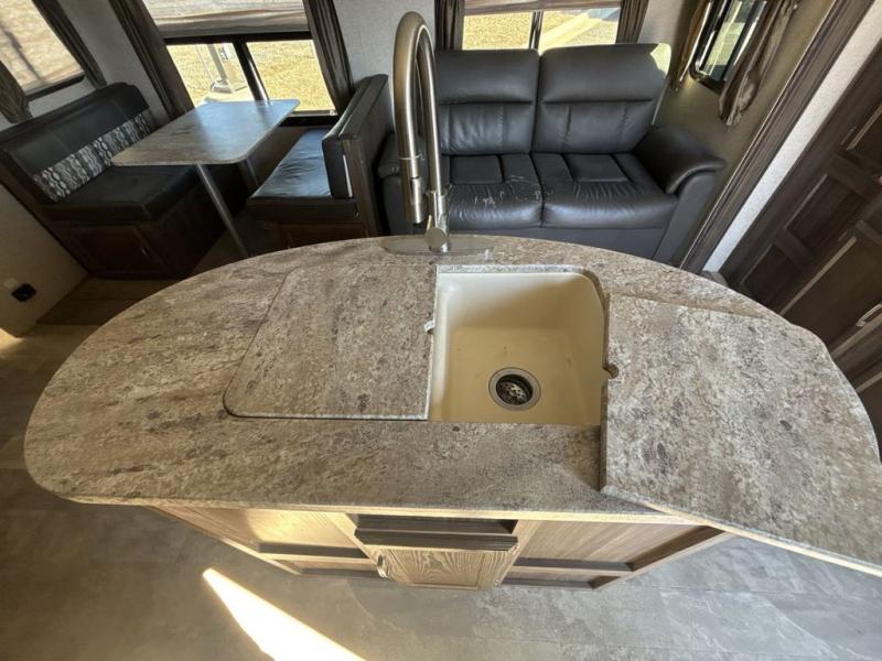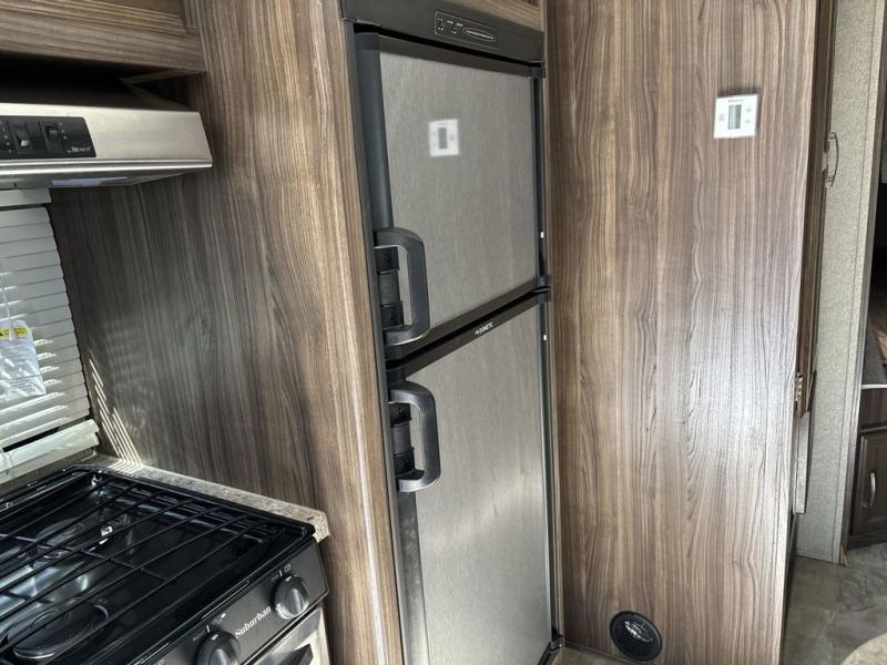 Step inside and find a wide open main living and dining area with a slide out kitchen to your left. The slide contains a three burner range with microwave overhead, a refrigerator, and storage. The kitchen island nearby offers a double sink, plus there is a pantry and wardrobe beyond the refrigerator side of the slide out for even more room to tuck things away.