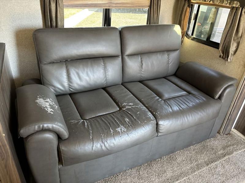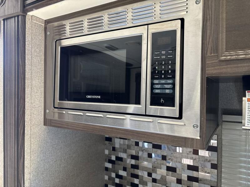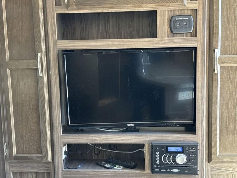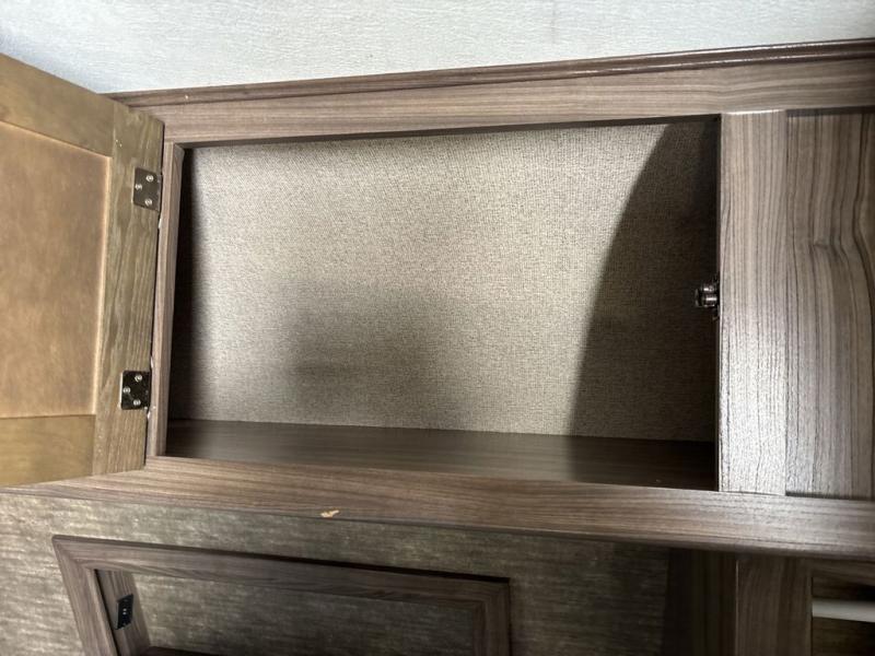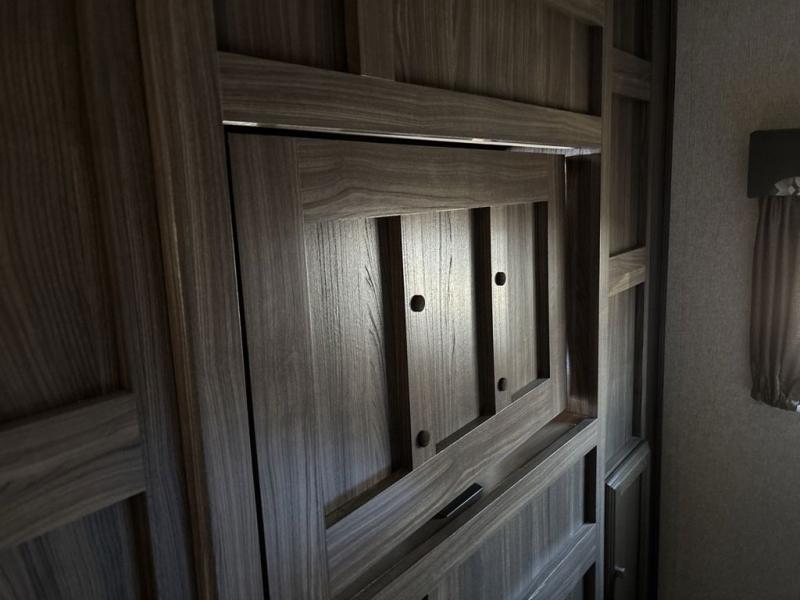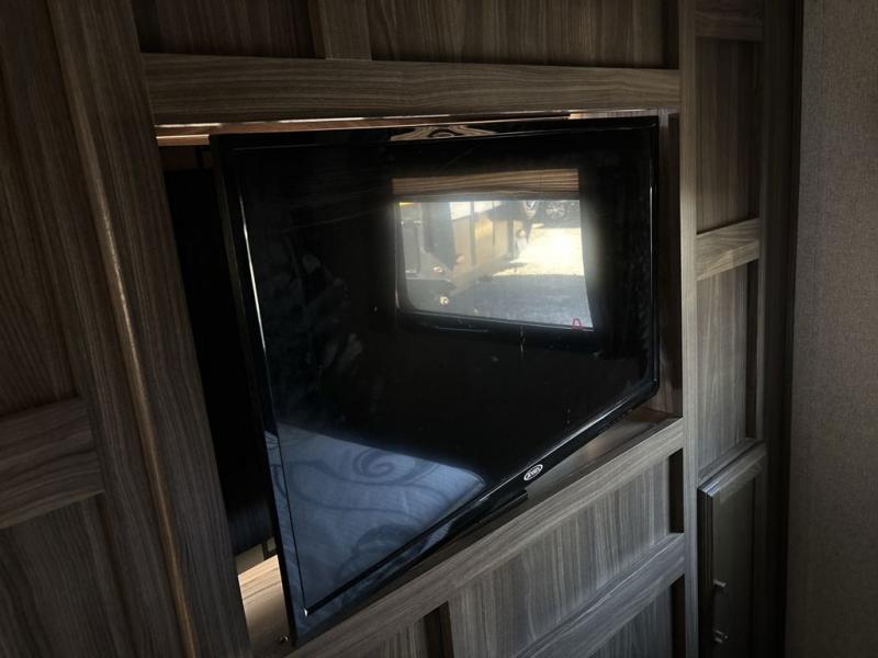 A sofa and booth dinette fill the slide opposite the door and provide some overhead cabinets above the sofa. A nearby entertainment center makes it easy to enjoy from any seating in the room.