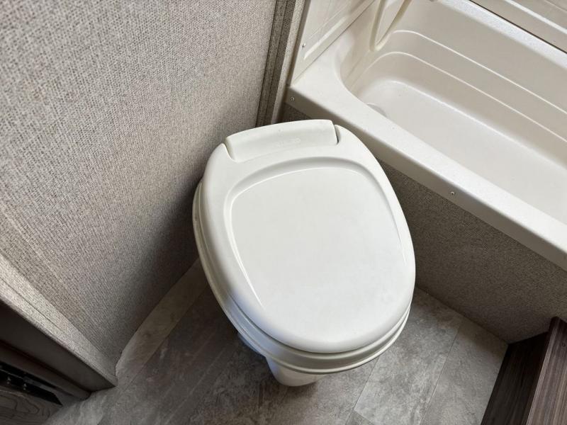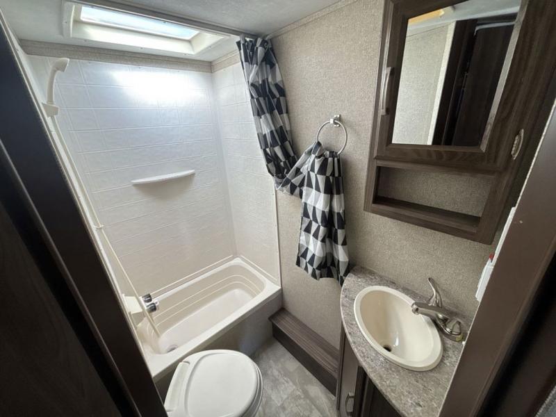 Back through to the rear of this Apex Ultra Lite find a set of double bed bunks. Both have the interior bottom cut at an angle to provide more moving around floor space, and there is a convenient bath with tub/shower, toilet and sink on the right.