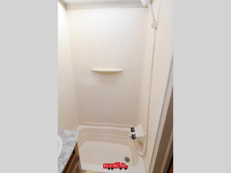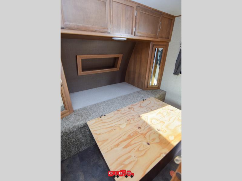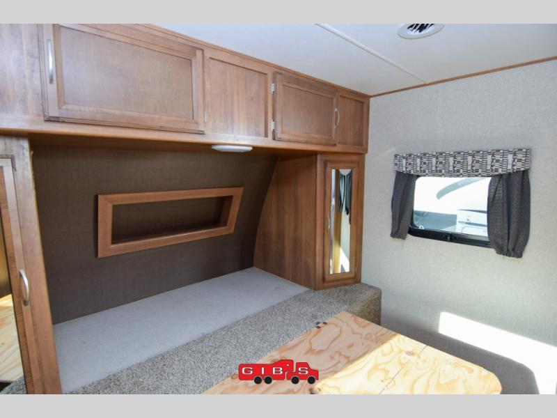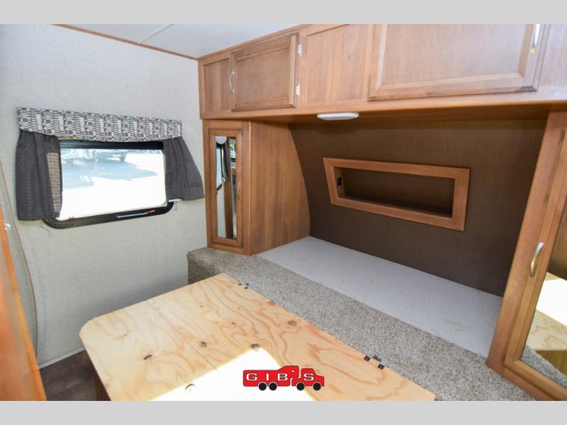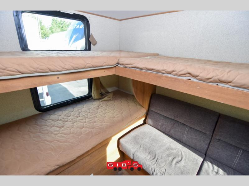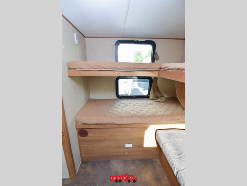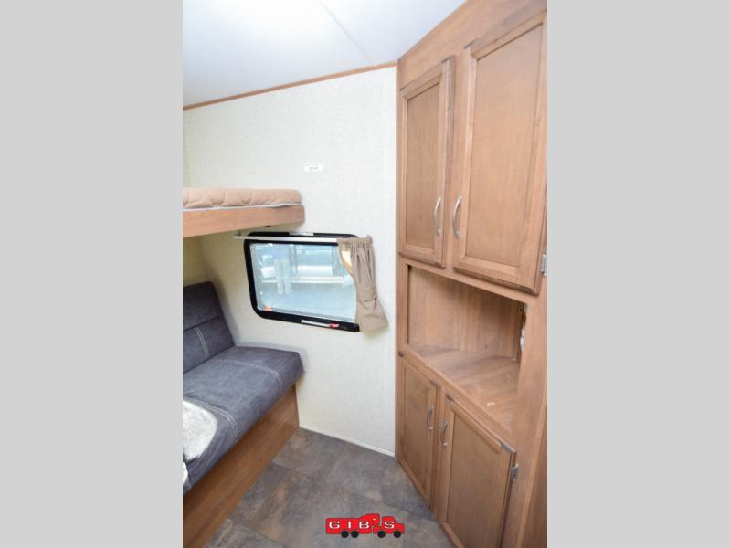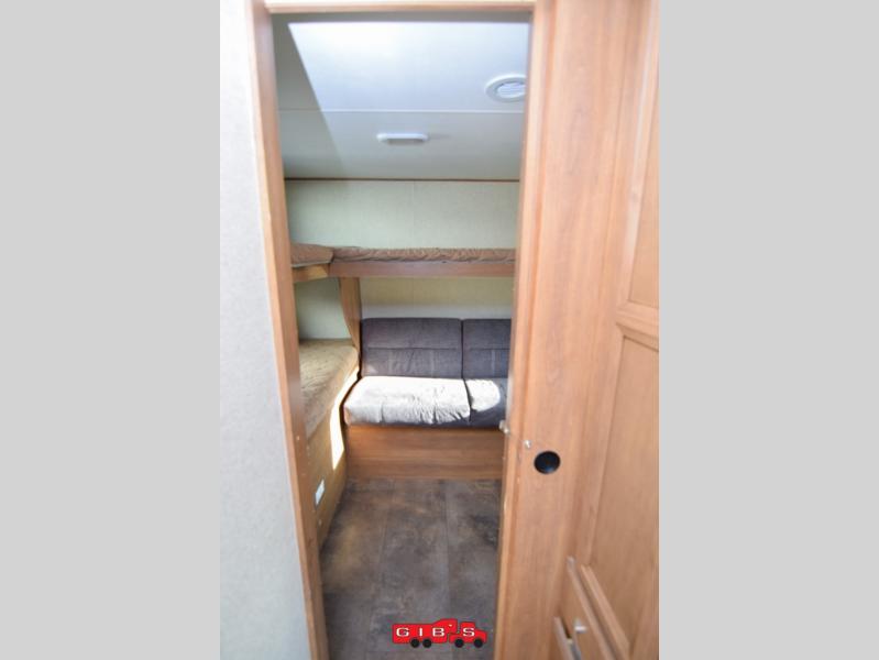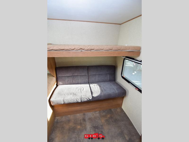 The rear bunkhouse features triple bunks in a L-shaped layout with a sofa below the flip up bunk. This is a great place to relax when you have friends over or your family wants to hang out and watch TV while laying around. There is also a corner wardrobe for clothing and a TV.