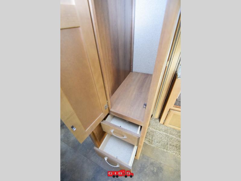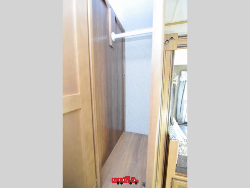 Stepping in the entry door there is a private bedroom right up front. It features a queen size bed and wardrobes for all of your storage needs.