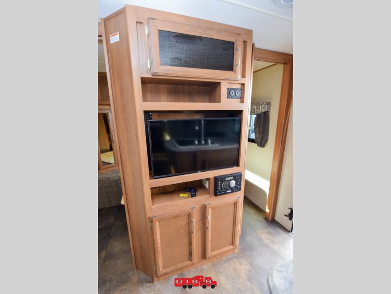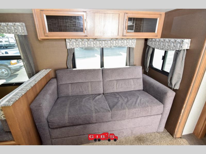 The living room and kitchen are combined with a sofa and dinette slide opposite the kitchen amenities. There is also an entertainment center on the interior wall that can be viewed by either side of the main living space.