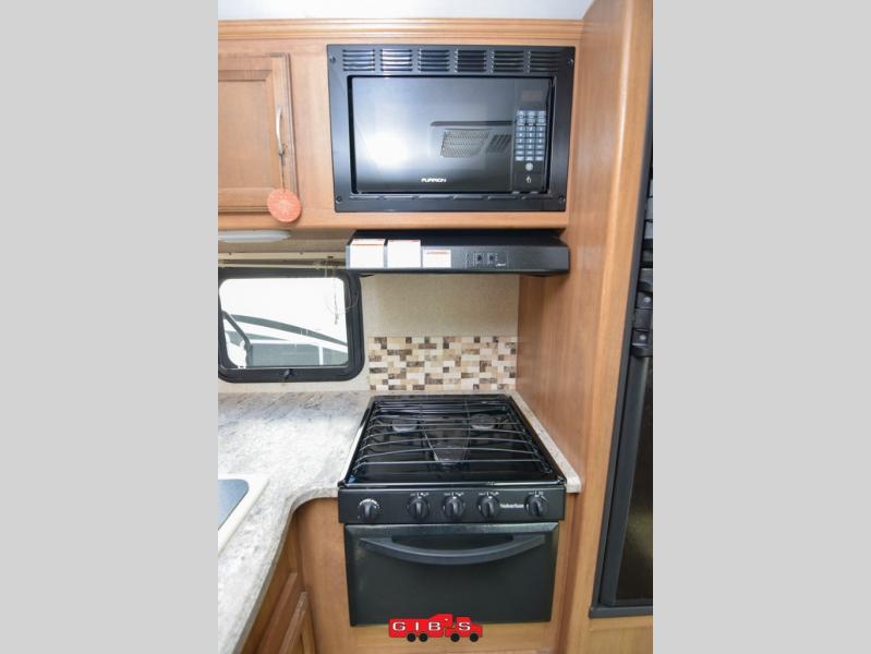 The complete kitchen features a refrigerator, three burner range, microwave oven, and overhead cabinets. The L-shaped countertop provides additional prepping space and a double sink.
