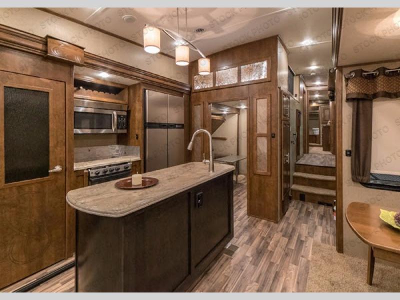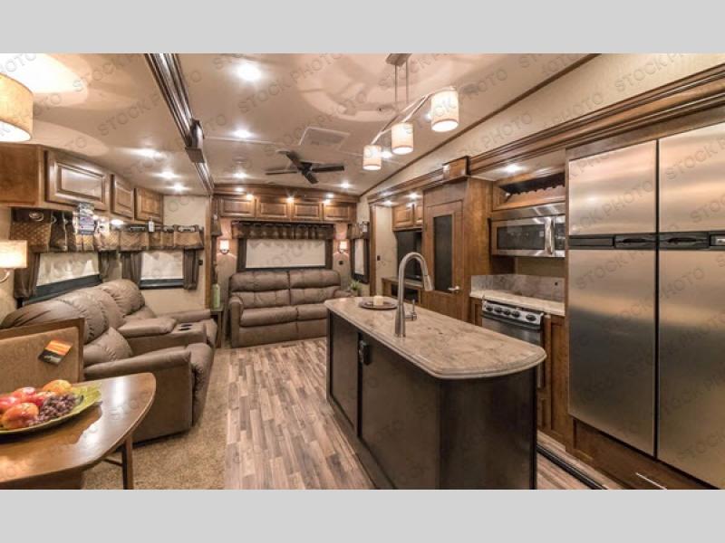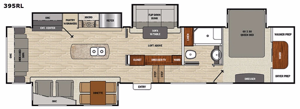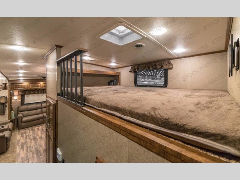 This Brookstone model is built for families who want room to spread out. Guests enjoy their own dedicated bedroom and loft, kids love the extra play and sleep zones, and adults appreciate a private master suite tucked away up front. Even rainy days become enjoyable thanks to the roomy living area, comfortable seating, and entertainment center. Whether you are hosting friends at the campground or embarking on cross-country adventures, the 395RL offers space, comfort, and capability for every moment.