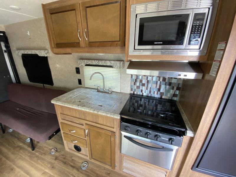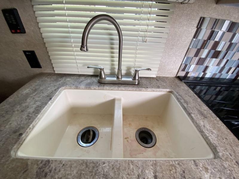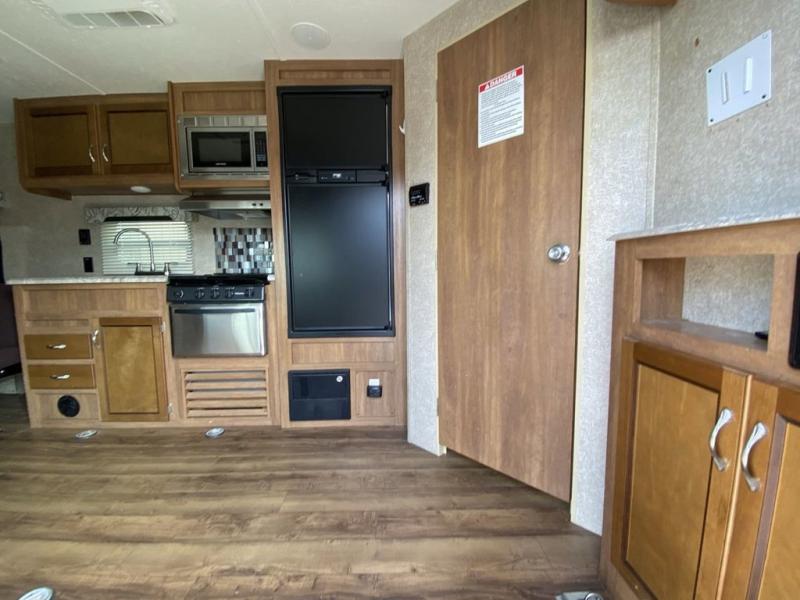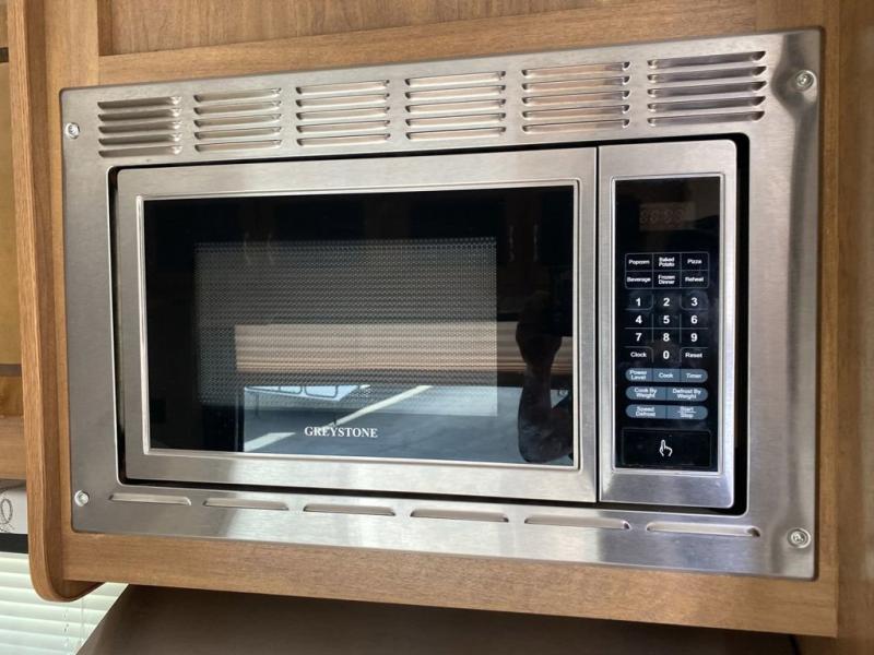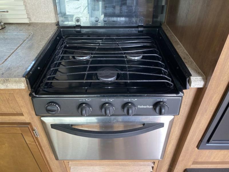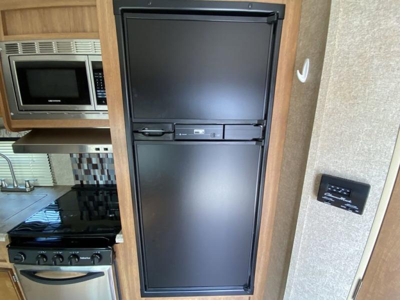 From the side entry door you will see the kitchen area straight ahead along the curb side wall. Here you will find a refrigerator for your perishables, a three burner range with overhead microwave oven, and a large sink for cleaning up. There are also cabinets for your daily dishes and other kitchen items. You will have no trouble whipping up meals and snacks to stay fueled for more fun!