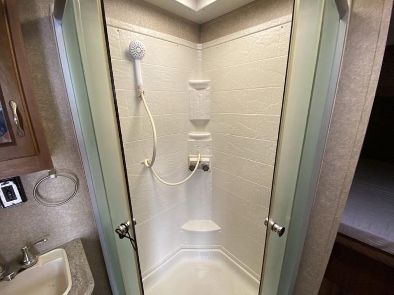 A walk-thru bath includes a 34" x 34" shower pan with glass shower door and single sink on your left, plus a toilet with overhead linen cabinet on your right. A second sliding bath door separates the bathroom from the front master bedroom which includes a queen size bed, dual bedside wardrobes, plus overhead storage.