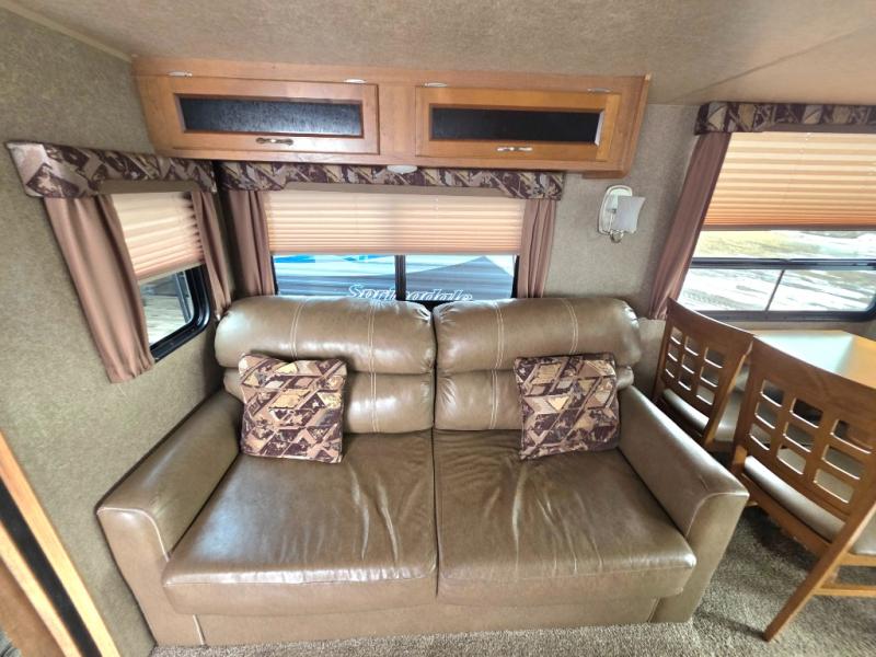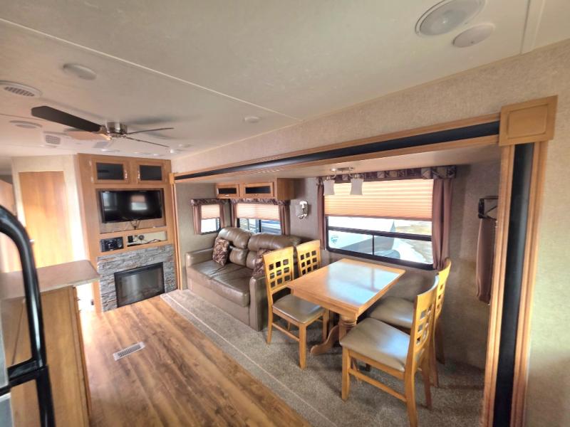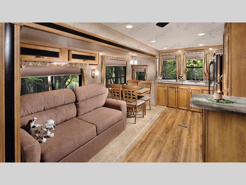 A booth dinette and sofa are in a slide out opposite the door side. Or you may choose an optional free standing dinette with four chairs in place of the booth dinette. With the nearby entertainment center and optional fireplace it is easy to see where everyone will enjoy hanging out.
