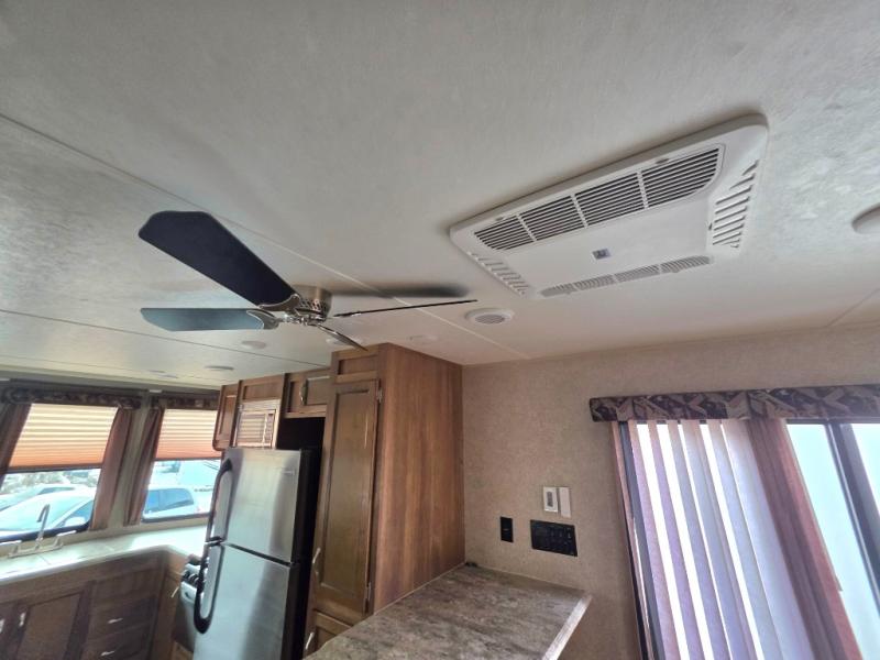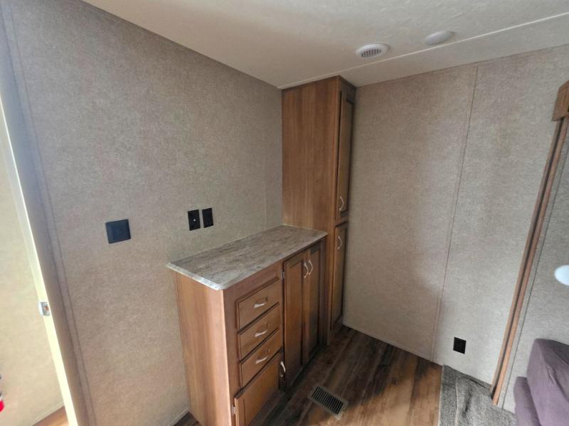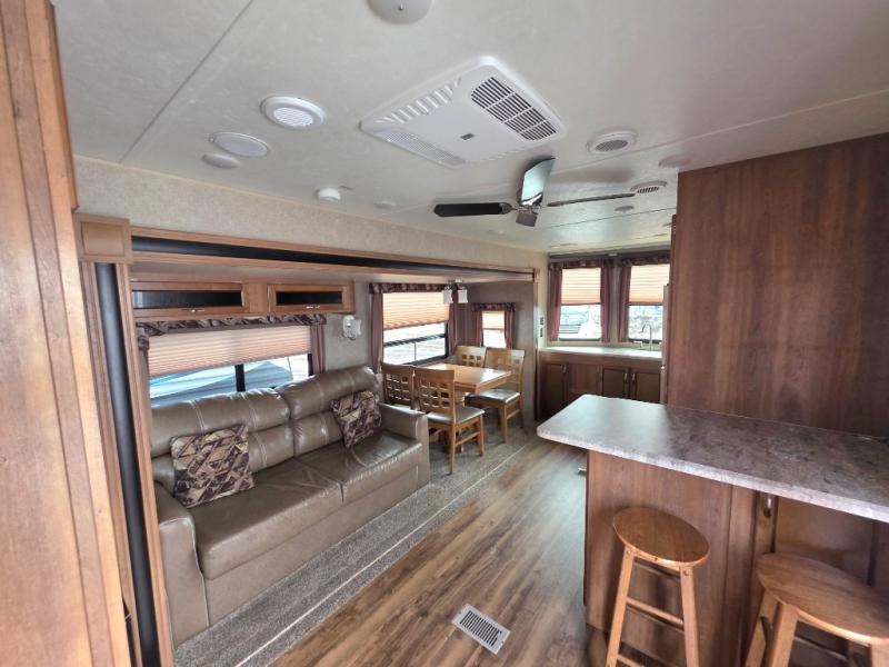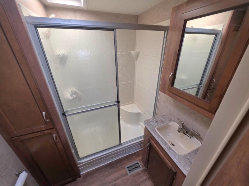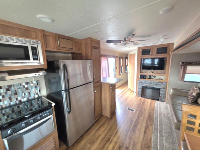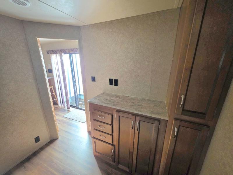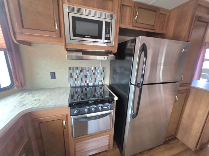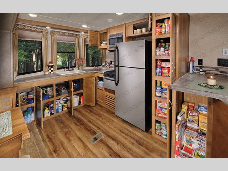 As you enter the glass patio doors in model 39FKTS you will immediately see a breakfast bar to your right with optional bar stools. Next, find a pantry, residential refrigerator, three burner range with microwave oven, counter space, and a sink. There are plenty of overhead cabinets for storage, and the front of this unit offers soffit lighting which is great in any kitchen.