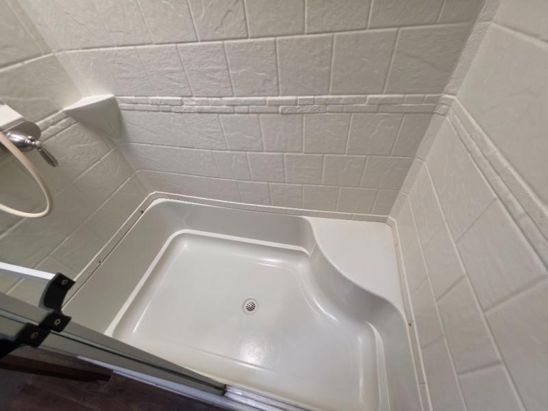 Continue on down the hall to a side aisle bath which provides a 48" x 30" shower pan with glass shower door. There is also a linen cabinet, toilet, and a sink with medicine cabinet as well. Directly across the hall from the bathroom is a second outside entry door which makes it convenient to access.