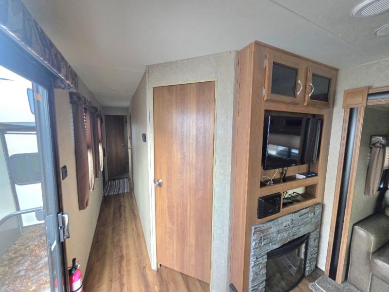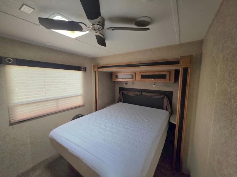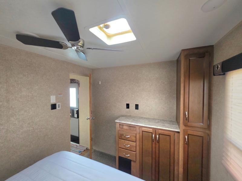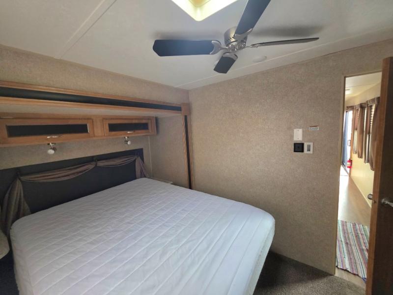 The private rear bedroom is the master and features a queen bed slide with nightstands on either side. There is a cabinet with TV top and a second smaller cabinet with shelves, plus so much more!